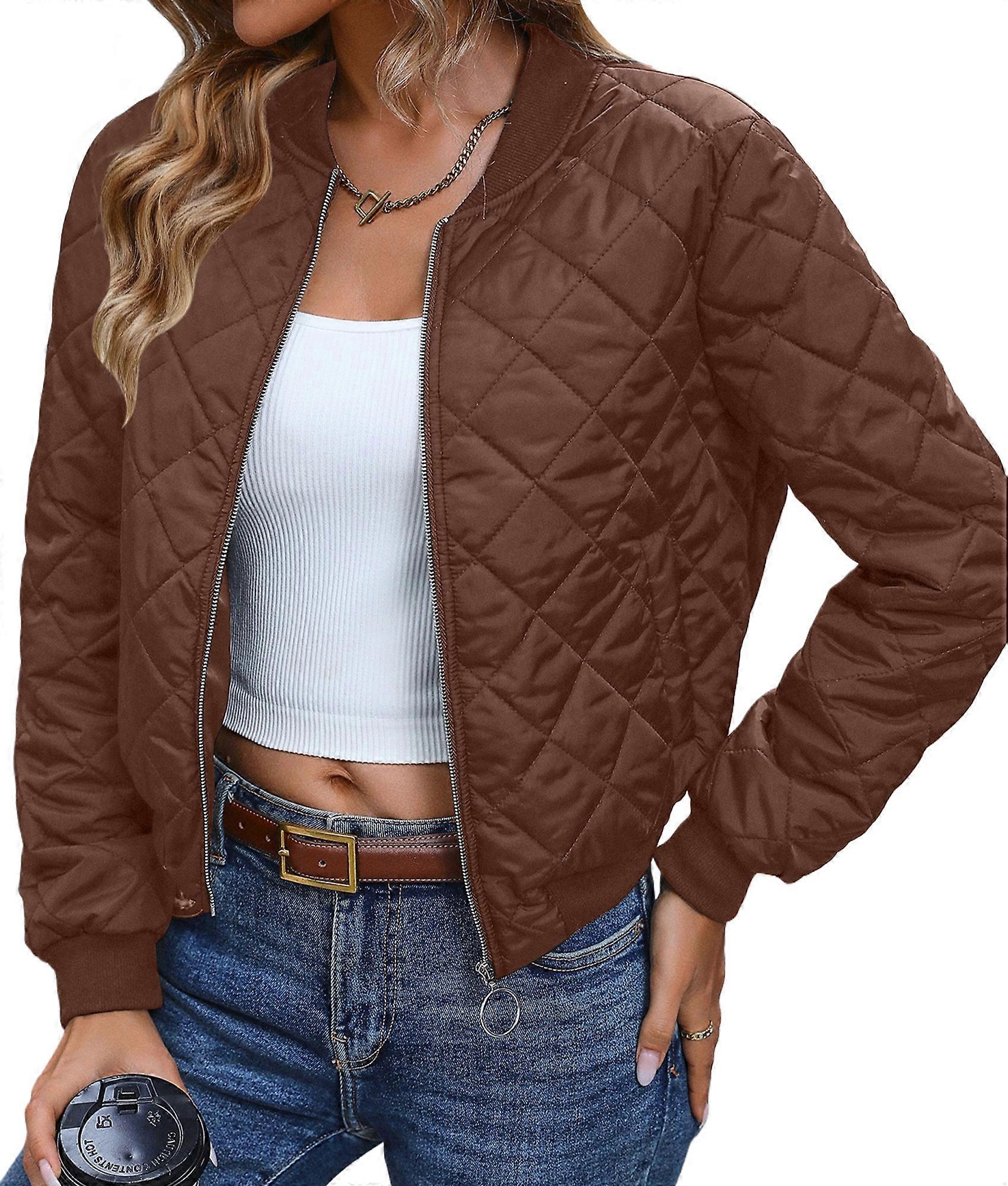 Female Stand Collar Quilted Puffer Jacket Padded Zip Coat Brown S