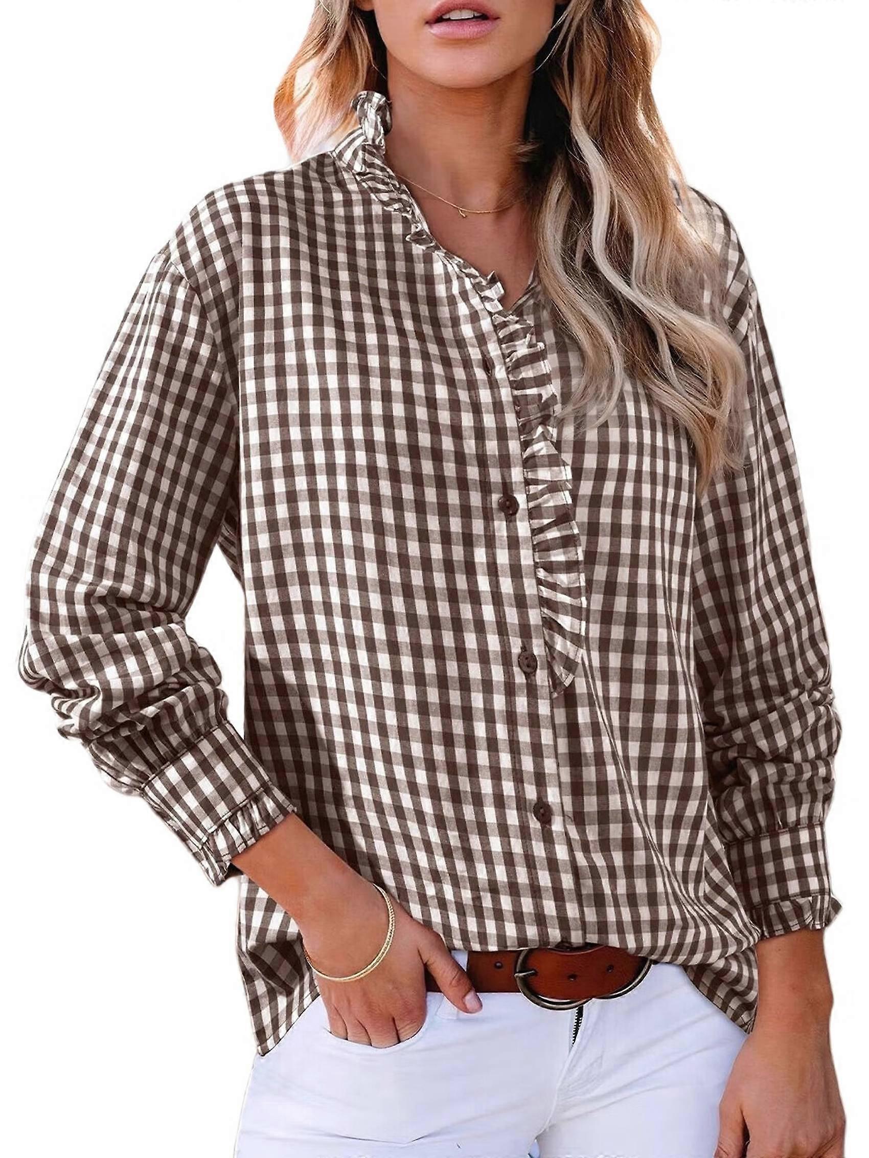 Women'S Plaid Ruffle V Neck Button Down Blouse Casual Long Sleeve Gingham Work Checkered Shirt Tops Brown M
