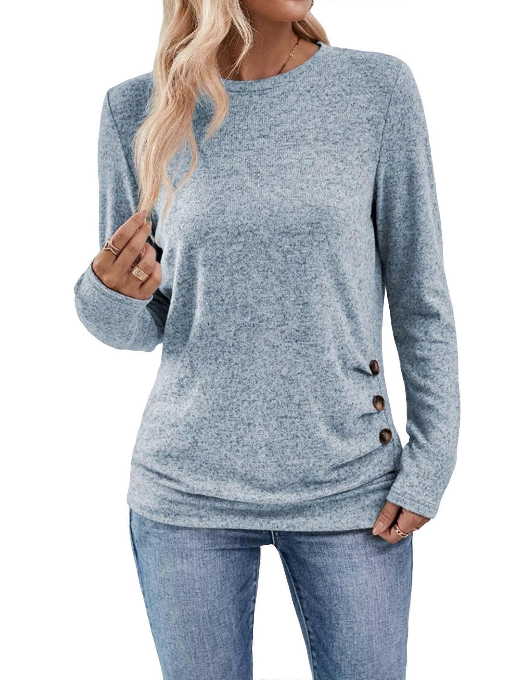 This women's long-sleeved pullover sweatshirt is made of 100% polyester blend fabric, offering a loose, comfortable, and soft feel against the skin. A casual long-sleeved shirt with a crew neck, button details, a relaxed fit, and a versatile solid color. A basic belted top, perfect for early autumn or winter. This pullover long-sleeved top can be paired with jeans, leggings, or a skirt. In winter, it can be layered with a thick cardigan, leggings, boots, and a scarf. In summer, it can be worn in cool environments such as air-conditioned offices. This women's long-sleeved shirt is perfect for everyday casual wear, suitable for home, school, office, work, shopping, vacation, travel, dates, and more, especially ideal for autumn. Size: XL=US10=UK14=EU42(cm / inch) Bust: 112.0 / 44.09, Length: 69.0 / 27.17 Colour: Sky Blue Material: 100% Polyester Package Contents: 1 * Womens Long Sleeve Shirts Tops Blouses Only the above package content, other products are not included. Note: Light reflection and different displays may cause the color of the item in the picture a little different from the real thing. The measurement allowed error is +/- 1-3cm.
