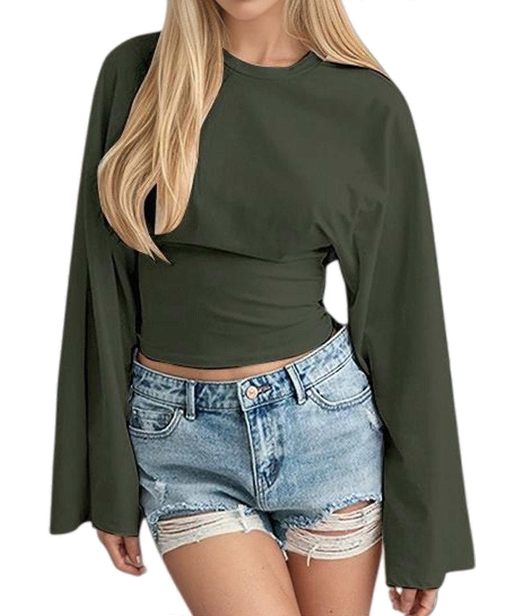 Women'S Solid Color Round Neck T-Shirt, Regular Sleeve with Flared Cuff and Waist Tucking Green L