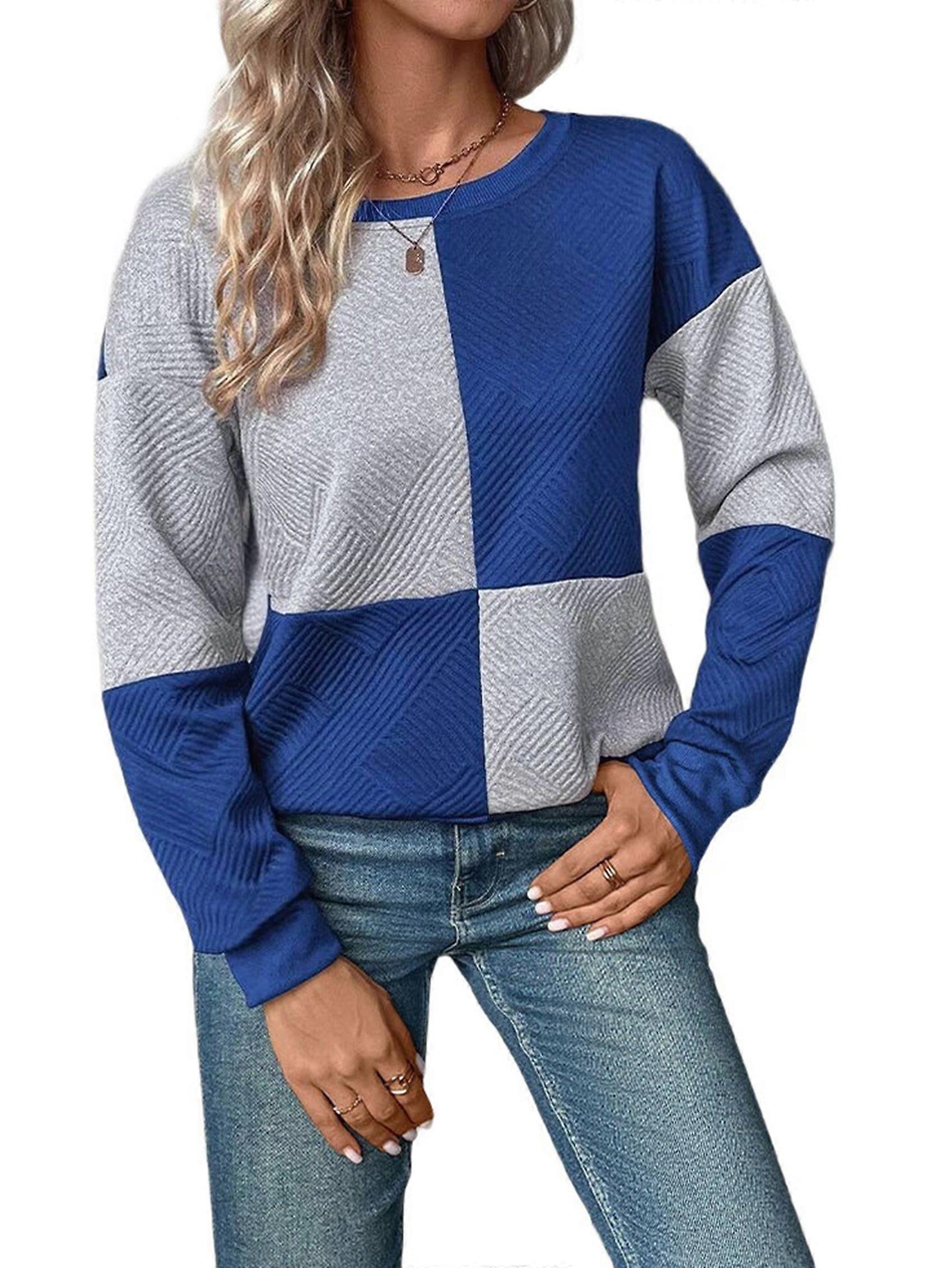 Female Pullover Hoodie Shirts Long Colorblocked Pattern Sleeve Pullover Sweater Blouse Tops Haze Blue L