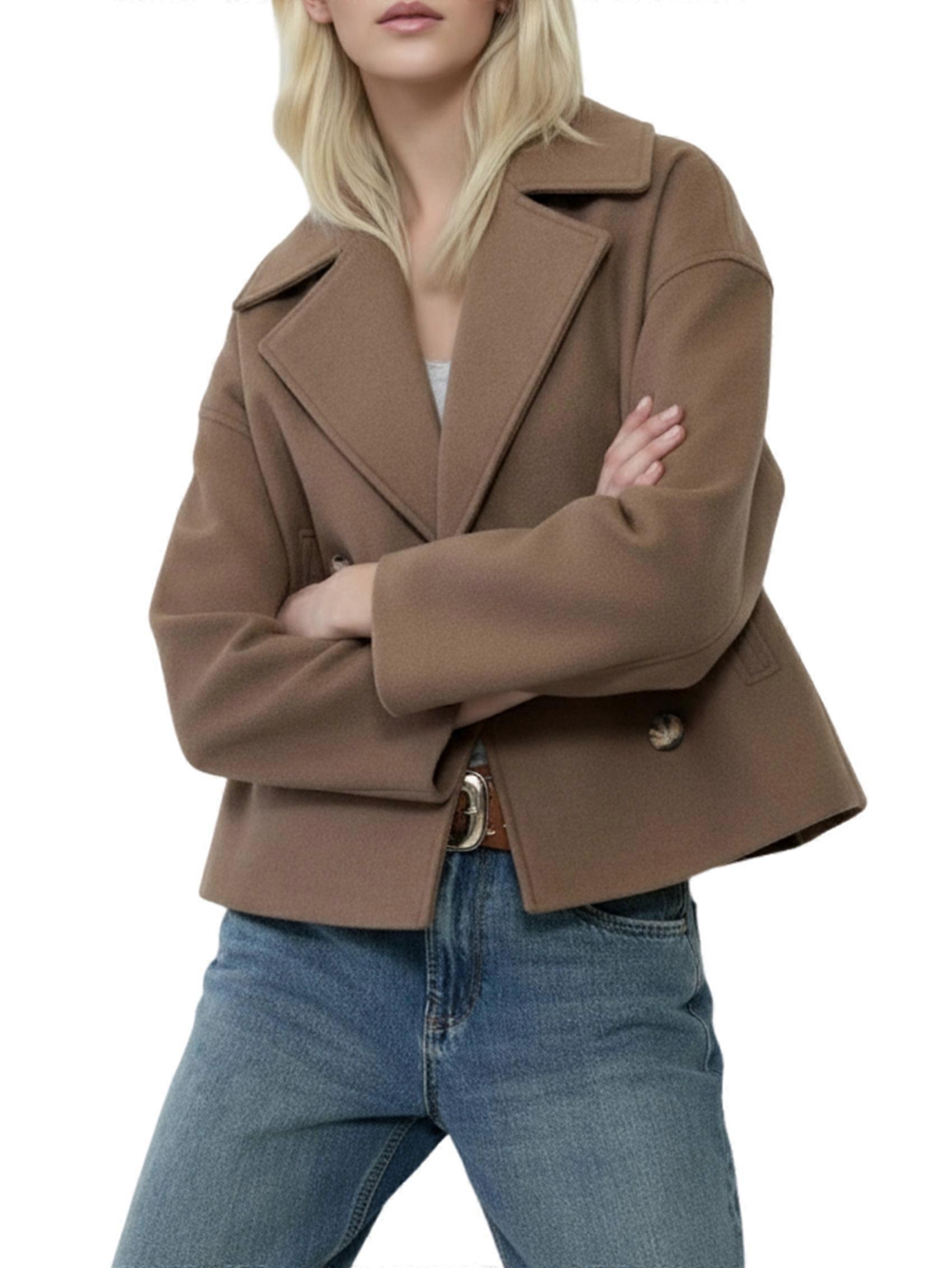 Women'S Fashionable Commuting Collar Double Row Buckle Short Woolen Loose Coat Camel Color S