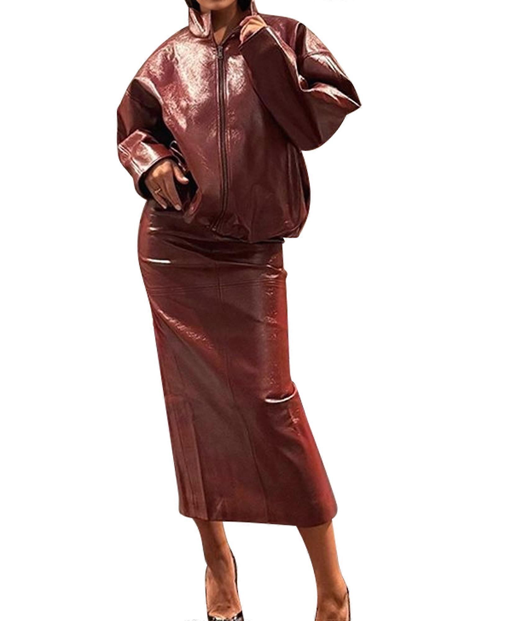 Women'S PU Leather Jacket Set with Lapel Long Sleeves Shiny Leather Jacket, and Leather Maxi Skirt Red M