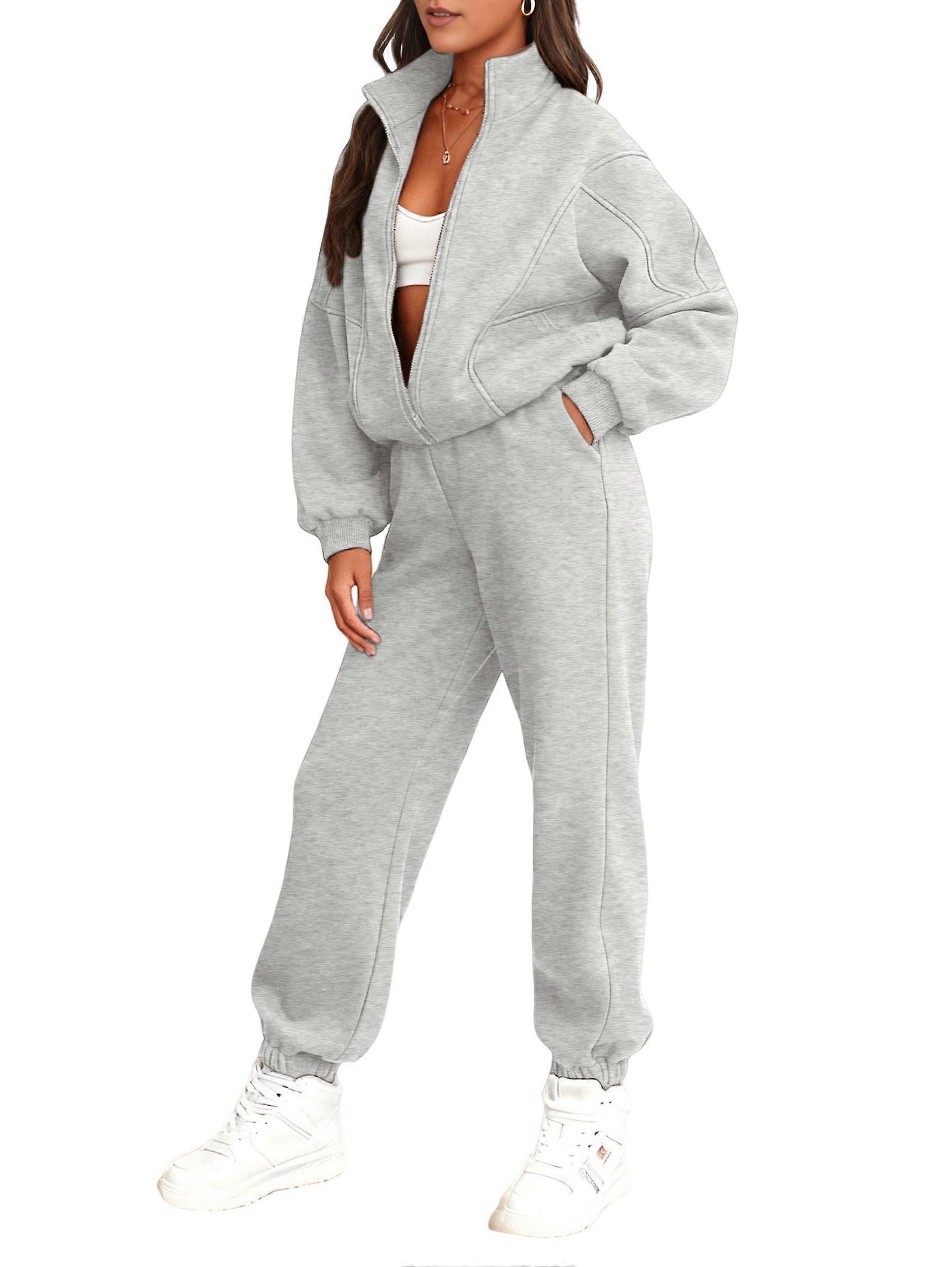 Women'S 2 Piece Outfits Casual Lapel Zip Sweatshirts and Wide Leg Pants Tracksuit Sets Light Gray XL