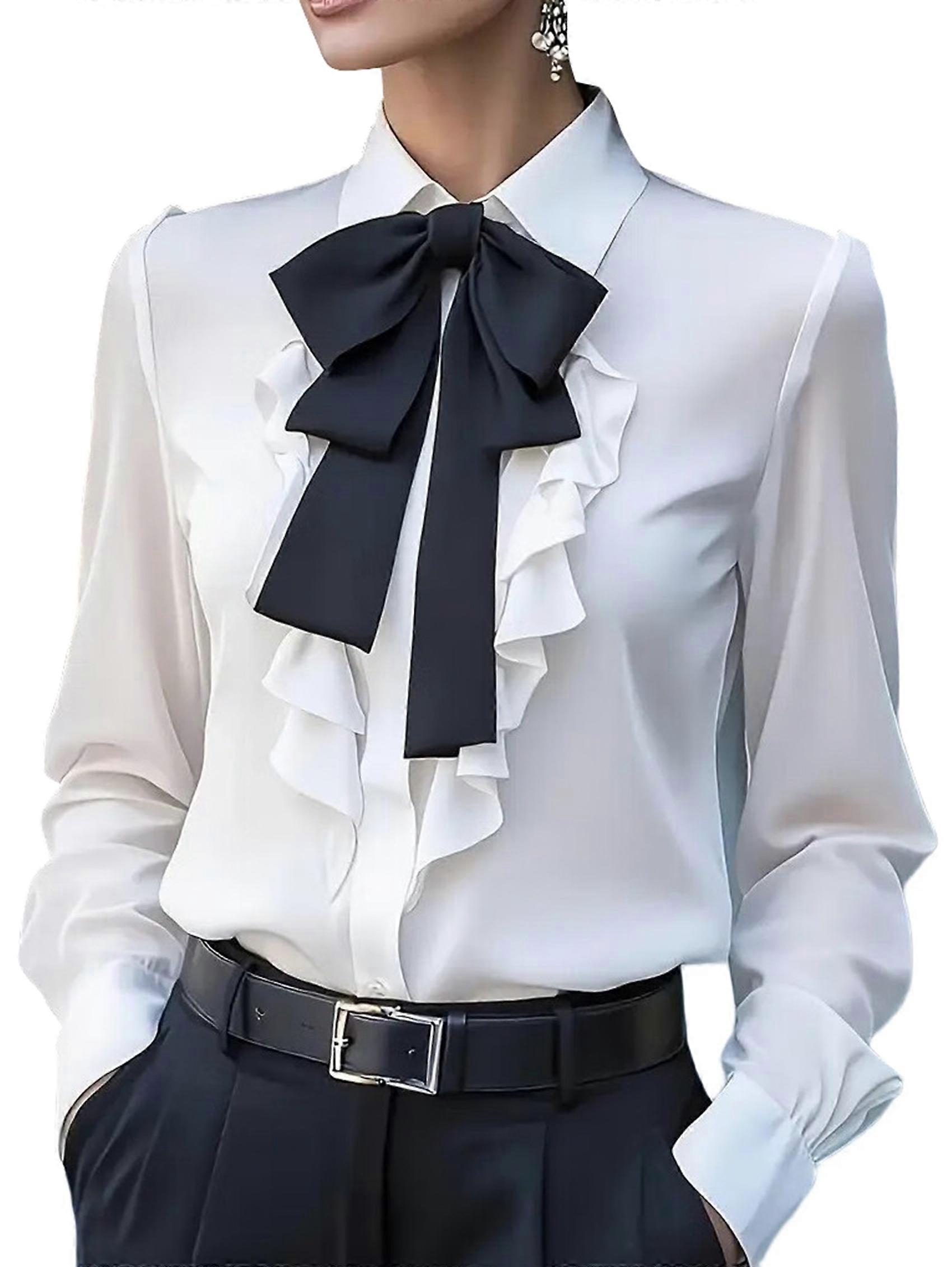 Women B-Ow Tie Neck Blouse Elegant Loose Button Down Ruffle Trim Shirts Long Sleeve Lapel Collar Tops White XXL