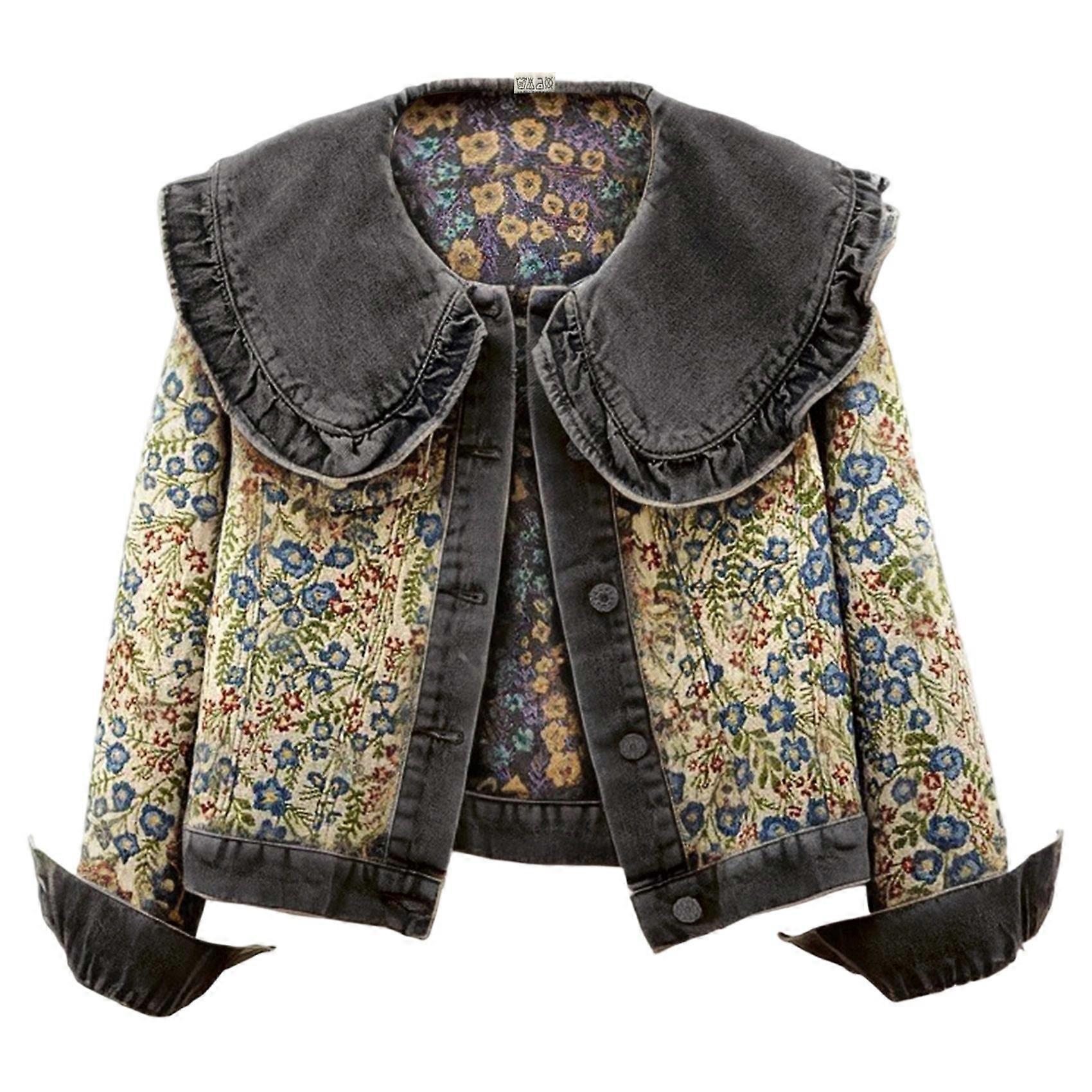 Women'S Sweet Pan Collar Long Sleeve Jacquard Denim Jacket Black M
