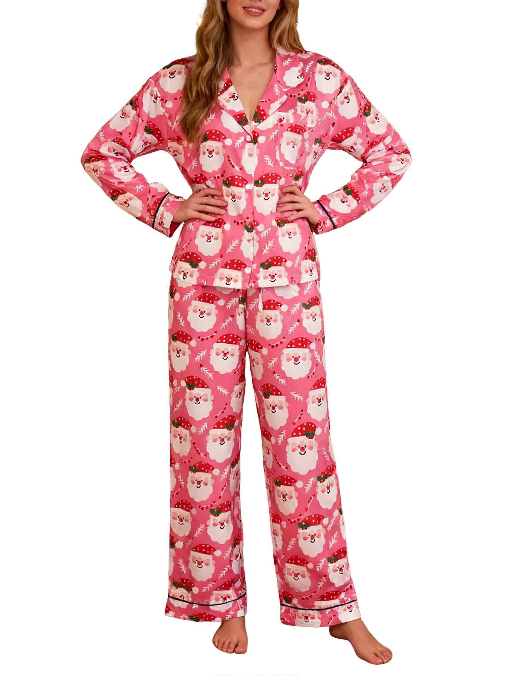 Women Cute Santa Christmas Satin Silky Pajama Set 2 Piece Loungewear Y2k Button Up Blouse Pjs Pants Pajamas Rose Red S