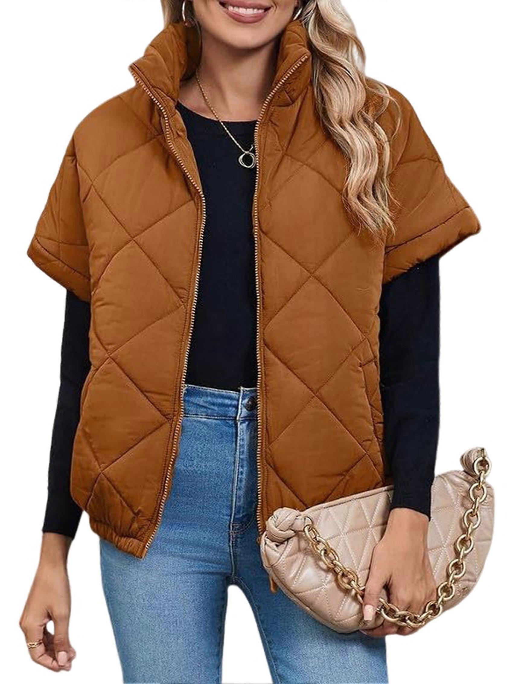 Quilted Jackets for Women Casual Short Sleeve Zip Up Warm Vests Caramel Color M