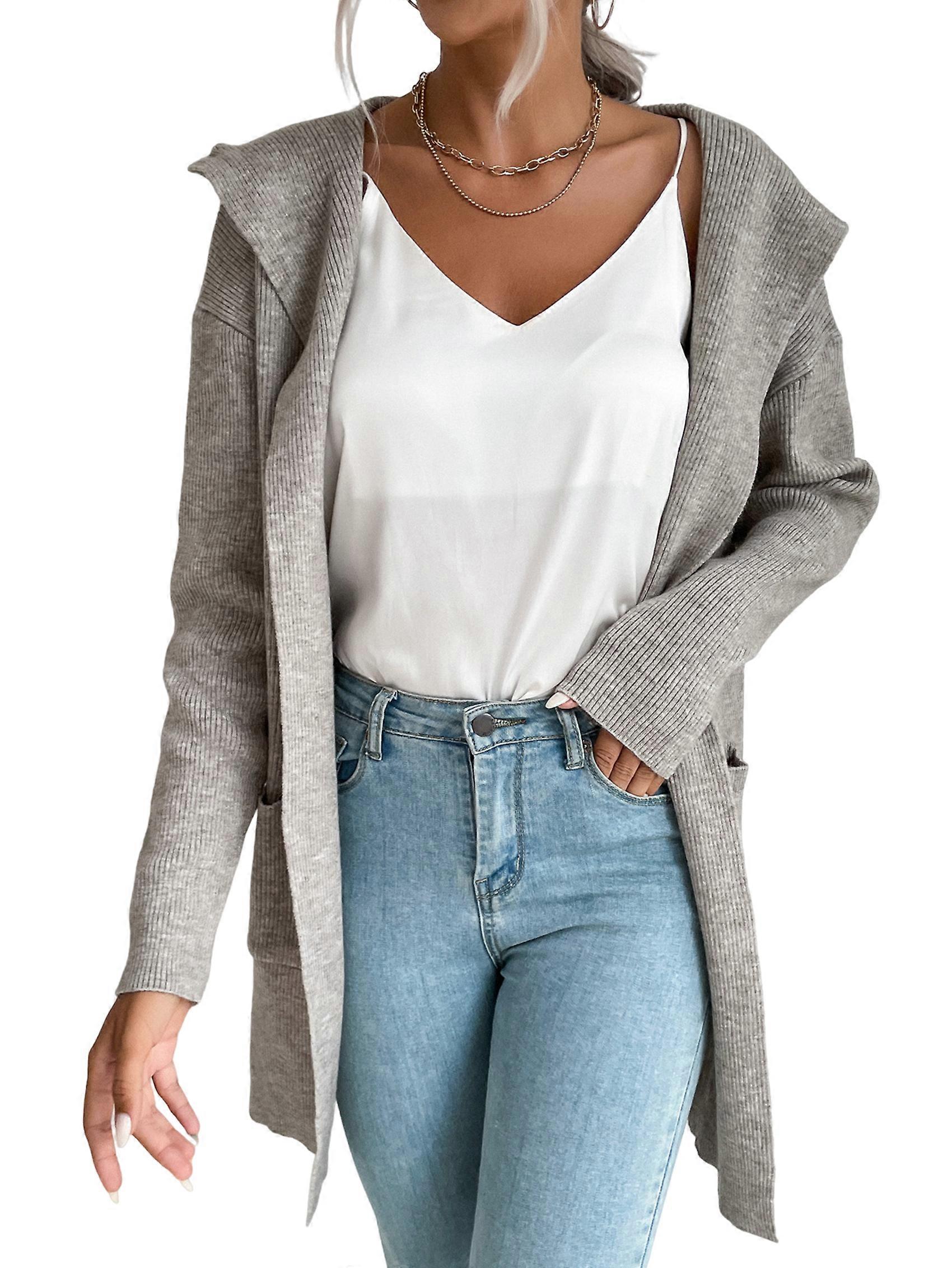 Women'S Hooded Open Front Cardigan Long Sleeve Lapel Rib Knitted Winter Fall Sweater Cardigan Coat with Pocket Gray S