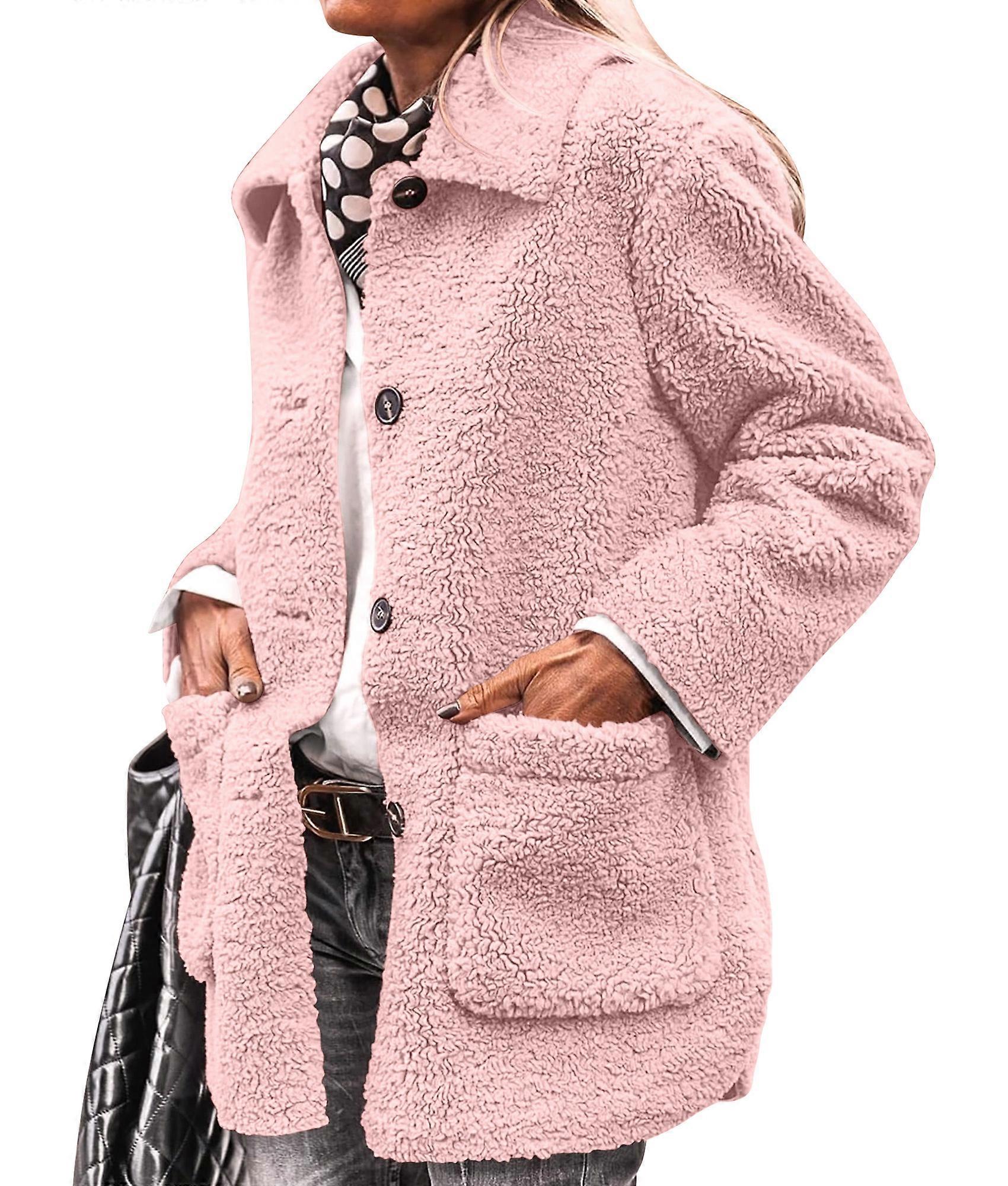 Women'S Winter Faux Fur Coats Long Sleeve Lapel Button Down Pockets Fleece Sherpa Jacket Casual Trendy Outerwear Pink S