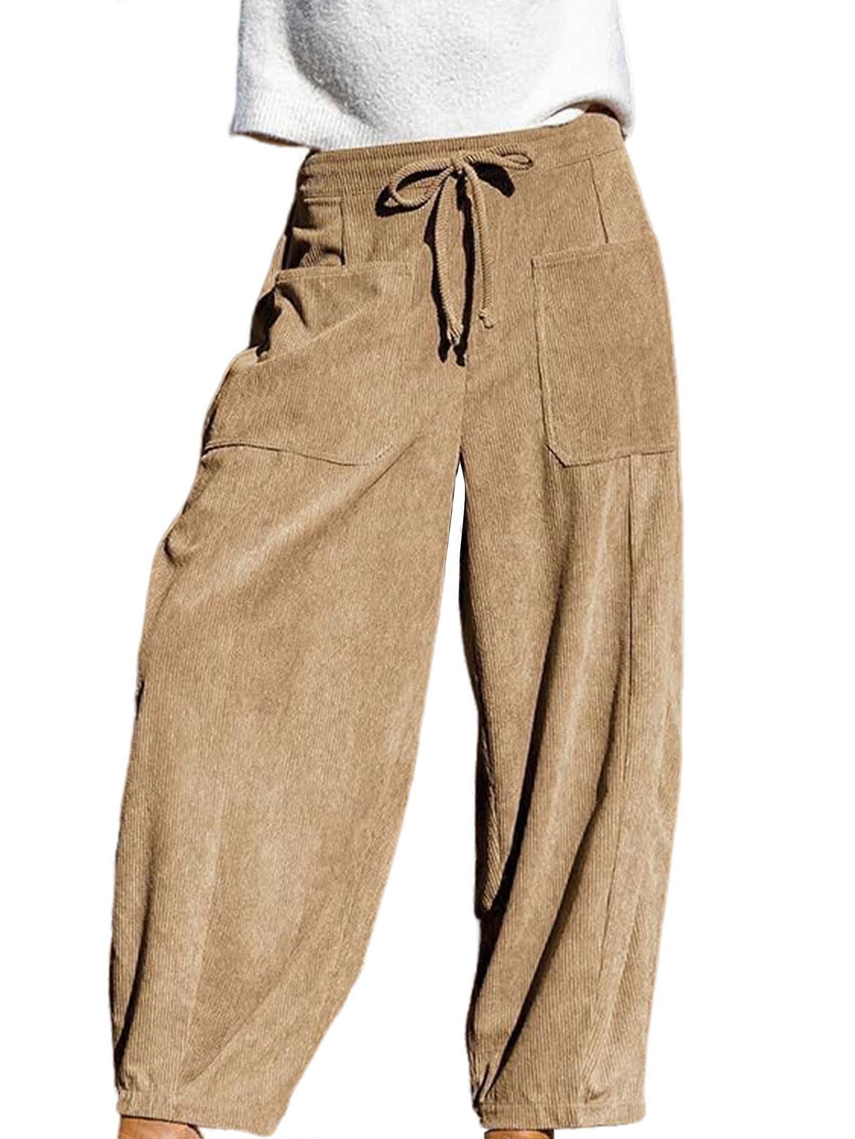Women'S Corduroy Pants Baggy Wide Leg Pants Casual Elastic Waisted Palazzo Harem Pants with Pockets Khaki S