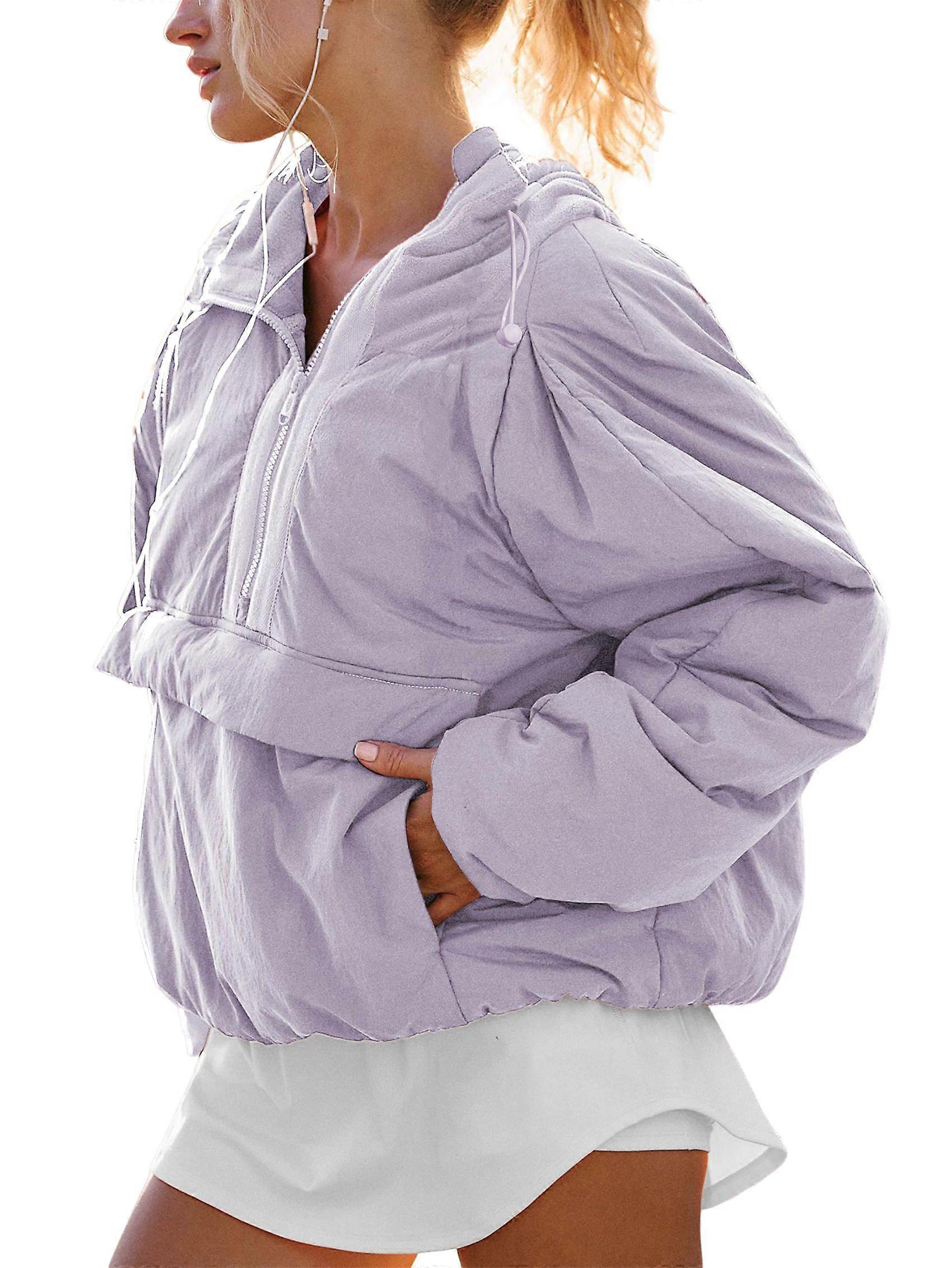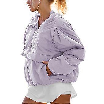 Womens Crew Neck Pullover Puffer Long Sleeve Loose Jacket Half Zip Hooded Coat with Drawstring Light Purple XXL