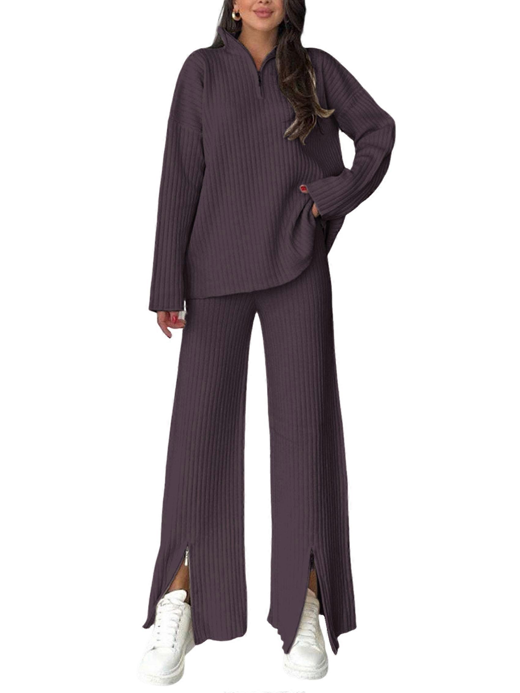 Women'S 2 Piece Sweater Sets Ribbed Quarter Zip Knit Top Zipper Split Wide Leg Pants Fall 2 Piece Outfits Purple 5XL