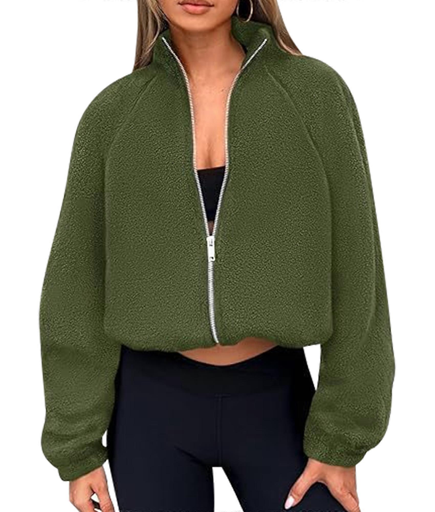 Womens Winter Fleece Jackets Long Sleeve Zip Up Cropped Warm Coats Fall Fashion Workout Outerwear Clothes Army Green M