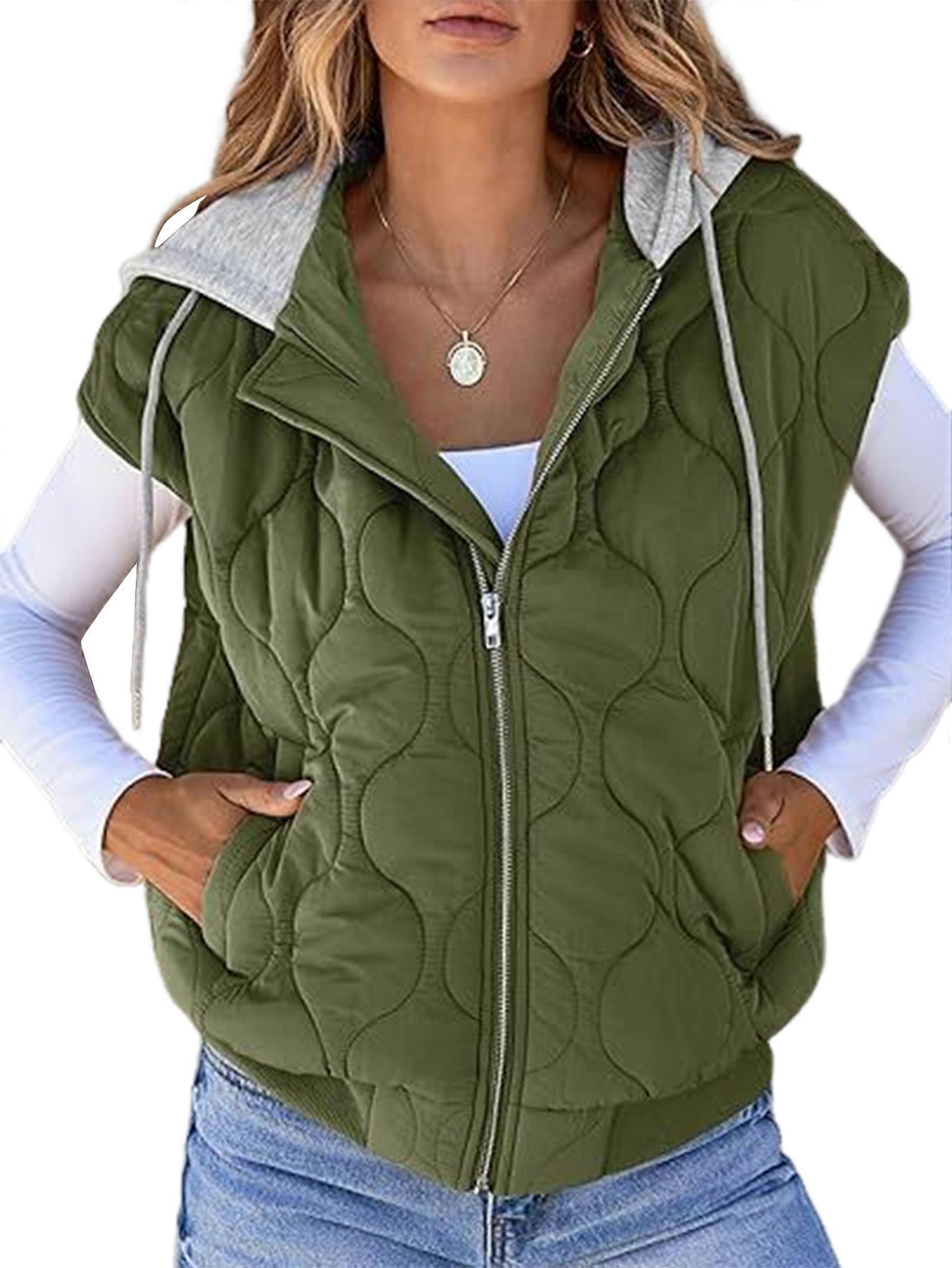 Women Cropped Hooded Zip Up Quilted Sleeveless Jackets Fall Light-Weight Coat with Pockets Army Green XXL