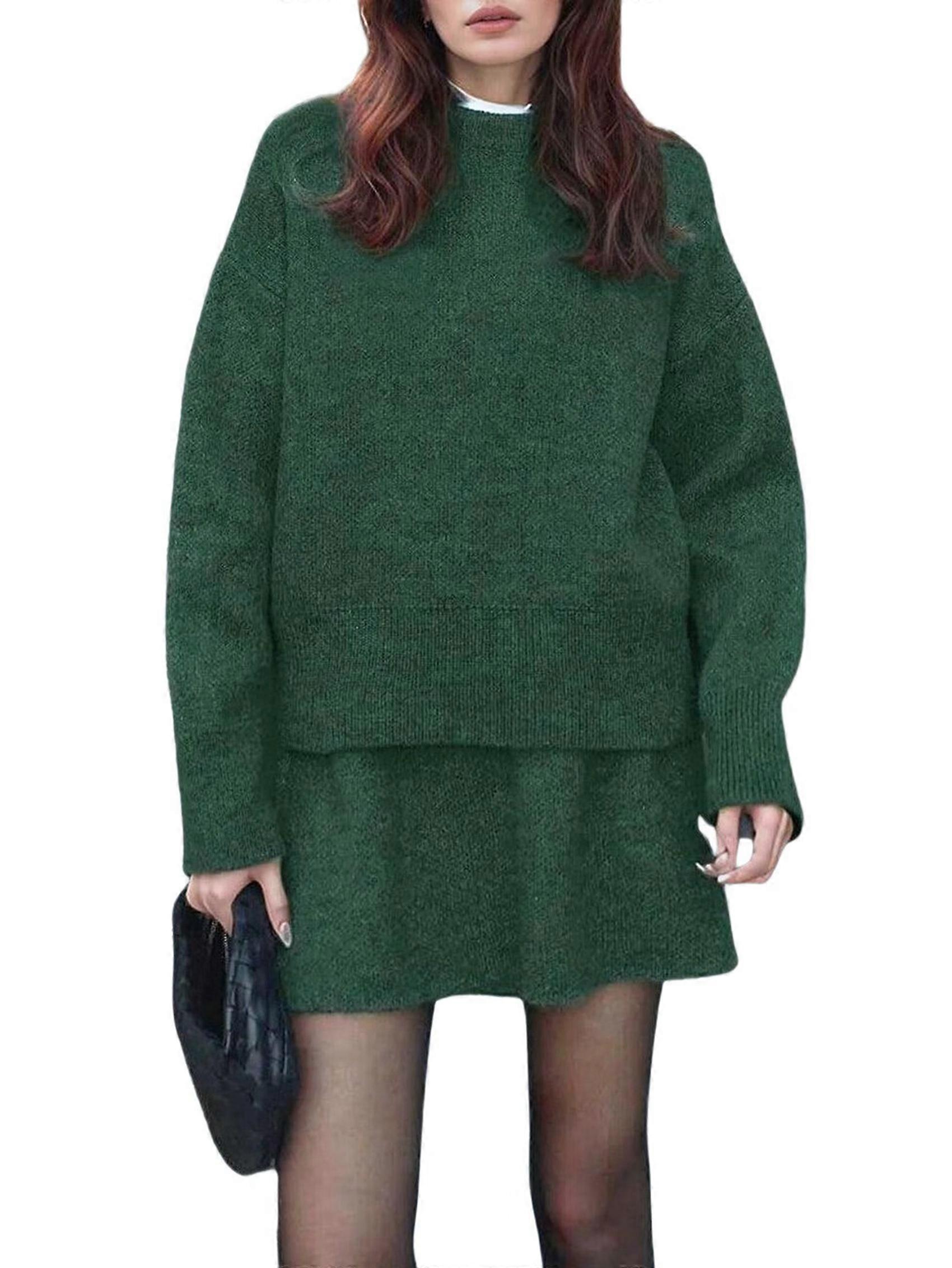 Women Sweater Skirt Sets 2 Pieces Outfits Loose Fit Pullover Sweater Knitted Mini Skirt Green XXL