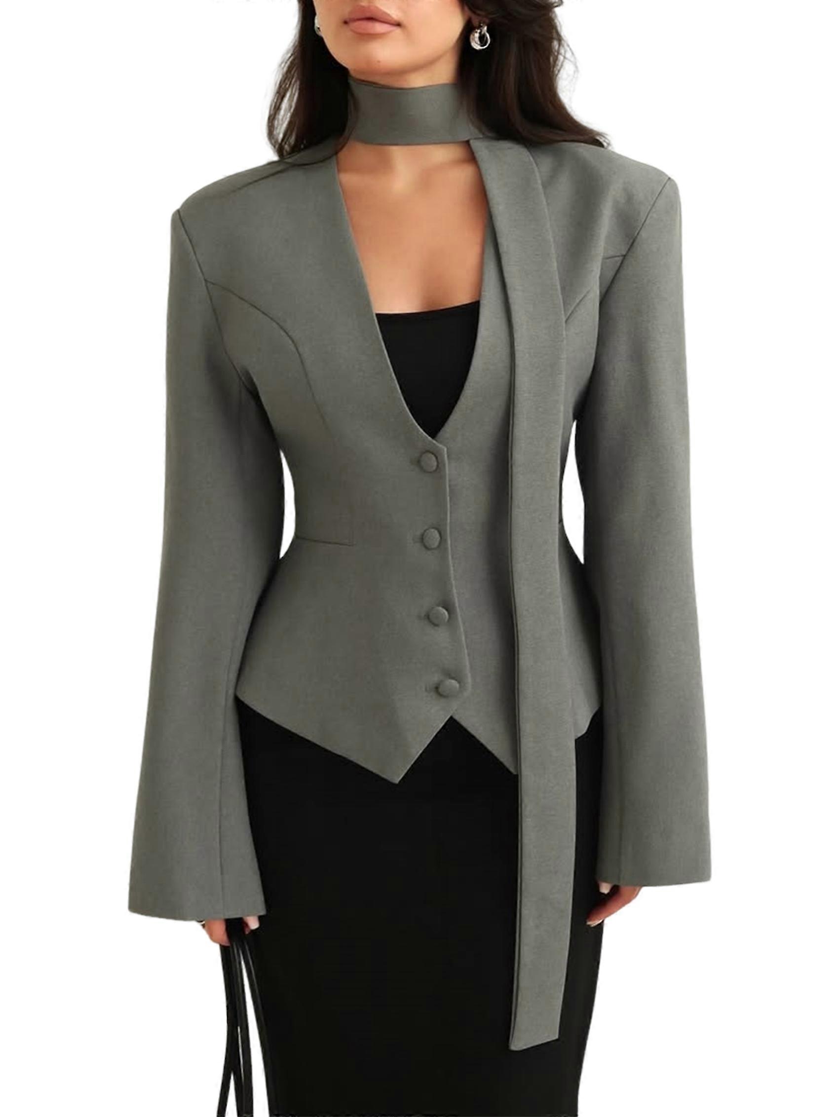 Female V Neck Long Sleeve Button Up Blazer Business Work Outfits Dressy Casual Fitted Suit Jackets with Belt Gray M