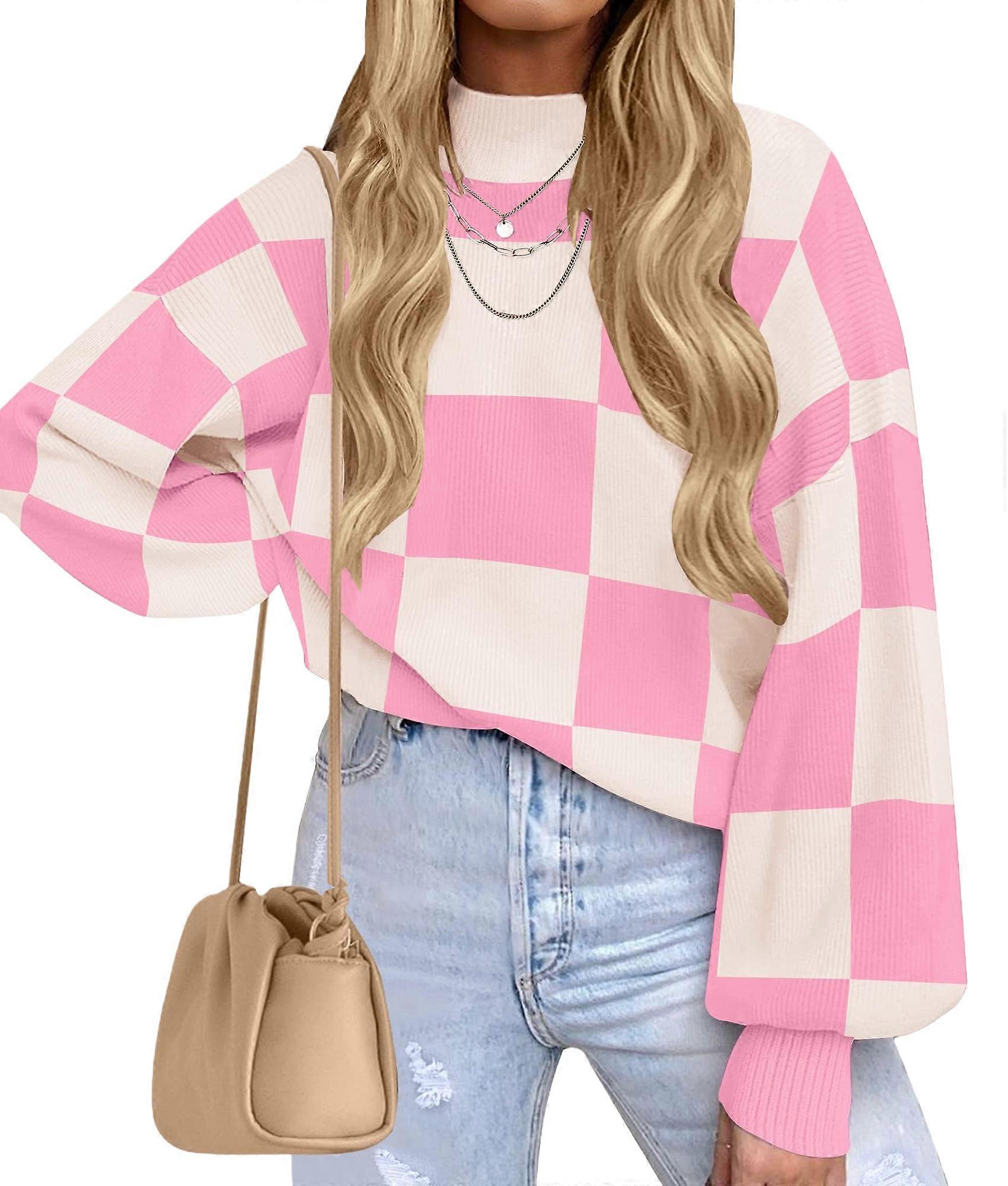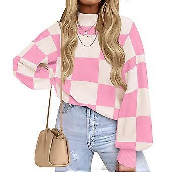 Women'S Fall Fashion Roll-Neck Long Sleeve Plaid Ribbed Knit Loose Pullover Sweater Tops Pink Checkered 4XL