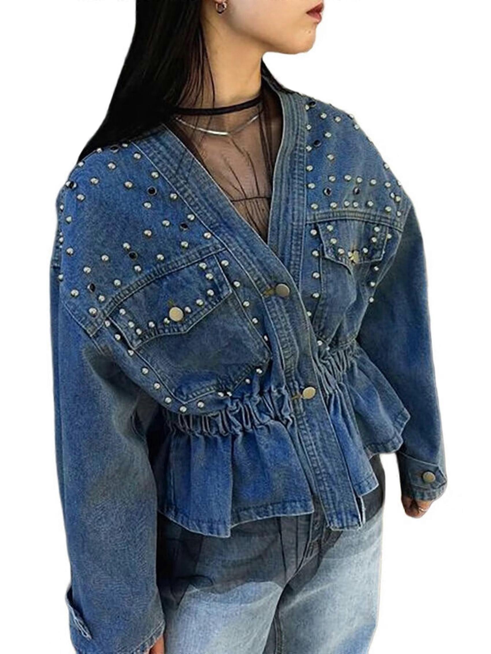 Women Beaded V Neck Button Down Motorcycle Denim Jacket Cinched Waist Streetwear Fall Clothes Trendy Dark Blue XXL