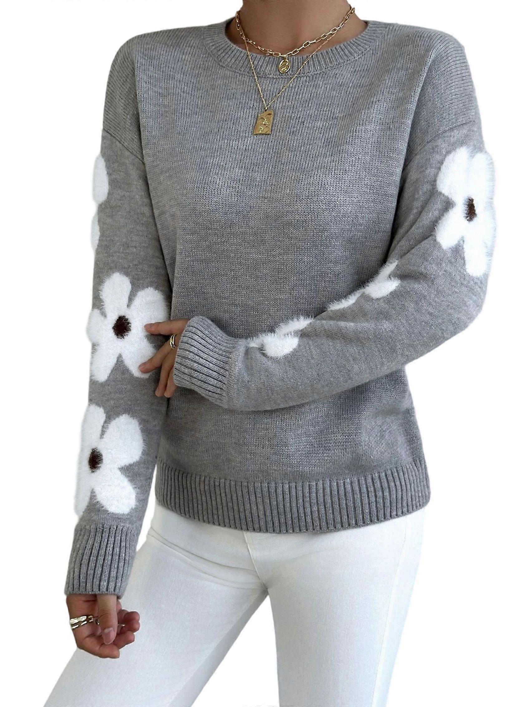 Female Floral Pattern Crewneck Long Sleeve Drop Shoulder Sweaters Pullover Tops Light Gray S
