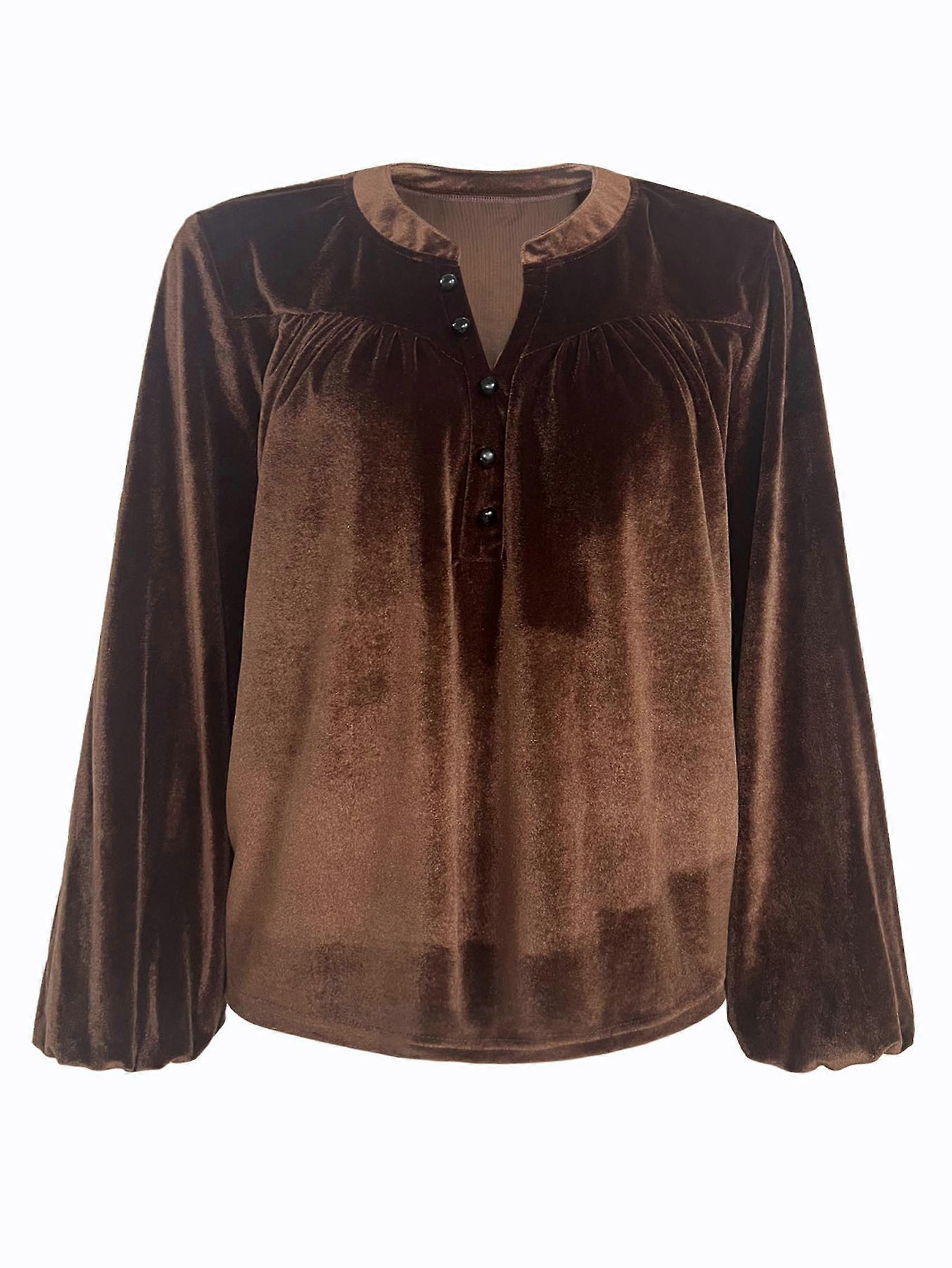 Womens V Neck Velvet Tops Vintage Lantern Long Sleeve Button Pleated Elegant Casual Fall Velour Blouses Brown XL