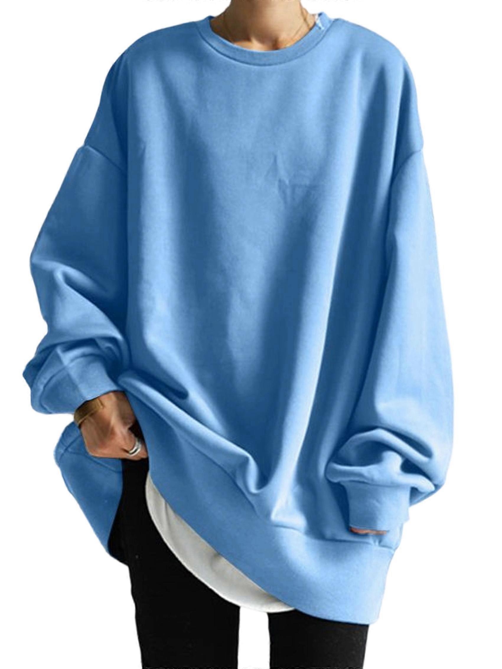Women'S Crew Neck Oversized Sweatshirts Long Sleeve Casual Loose Pullover Tops Solid Color Cotton Fall Clothes Light Blue M