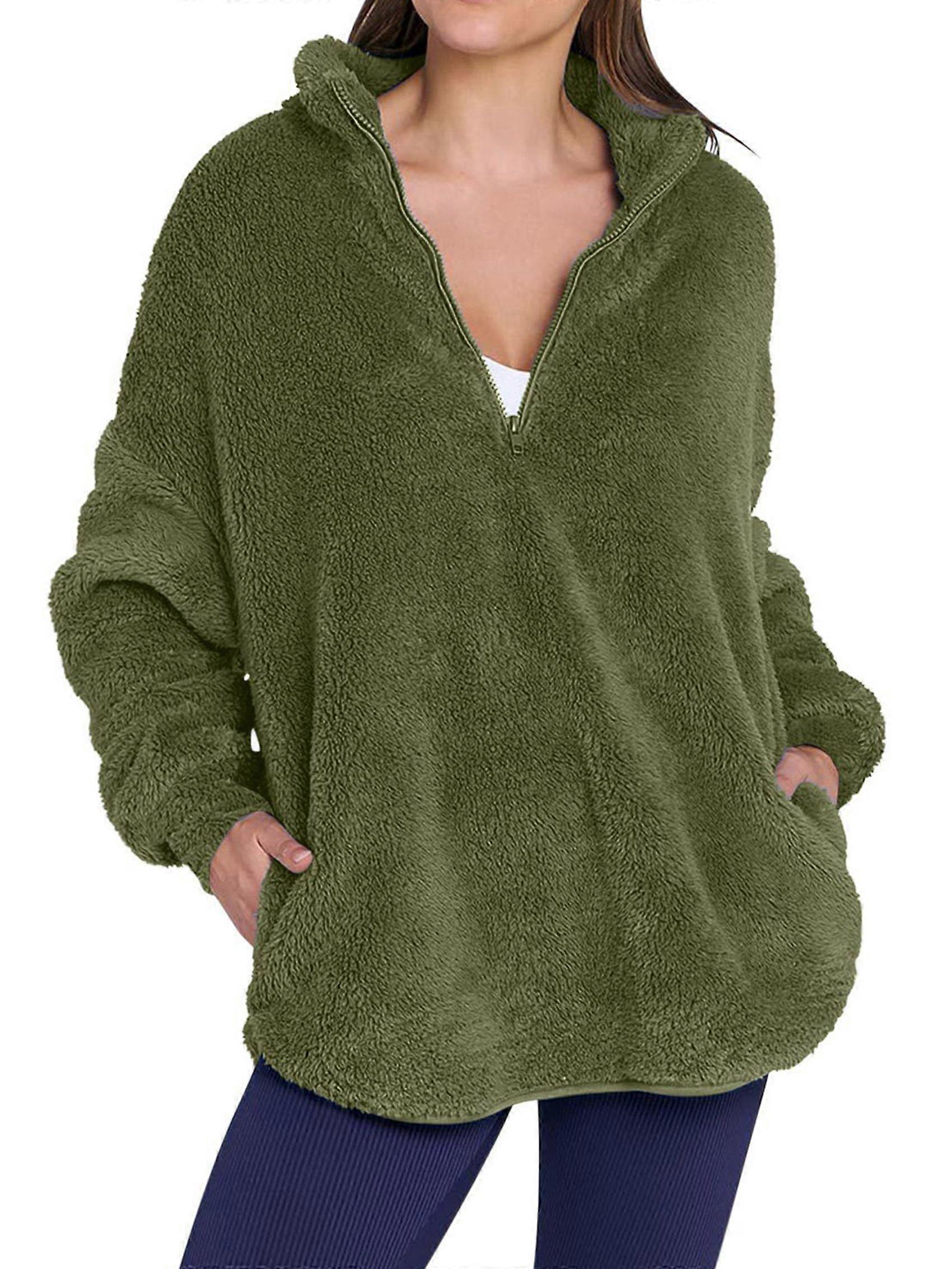 Women'S Plush Half Zip Stand Collar Sweatshirt Comfortable Pullover Long Sleeve Top Autumn and Winter Army Green XXL