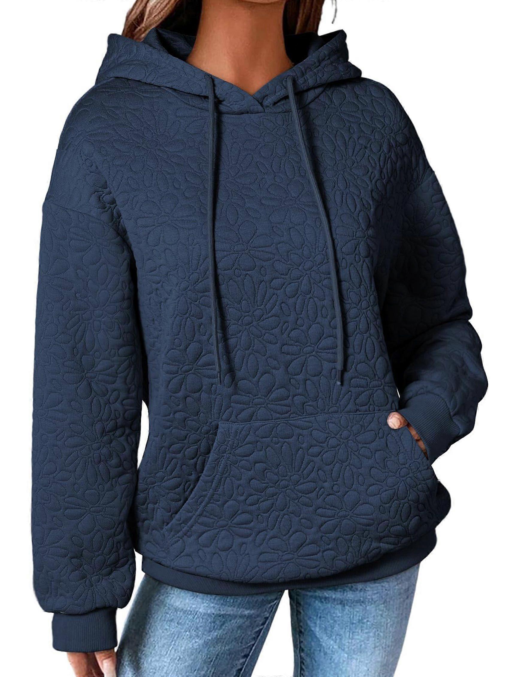 Women Hoodies Casual Long Sleeve Drawstring Jacquard Sweatshirt Pullover Tops Loose Outfits Clothes Navy Blue L