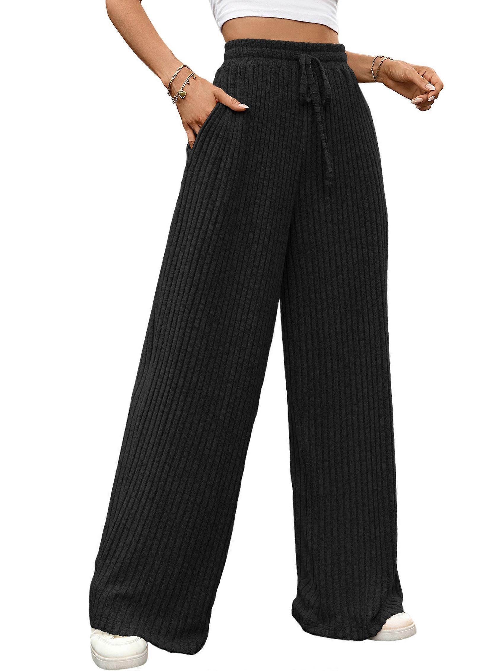Women Ribbed Wide Leg Lounge Pants with Pockets Casual Relaxed Comfy Loose Soft Knit Pajama Pants with Drawstring Black L