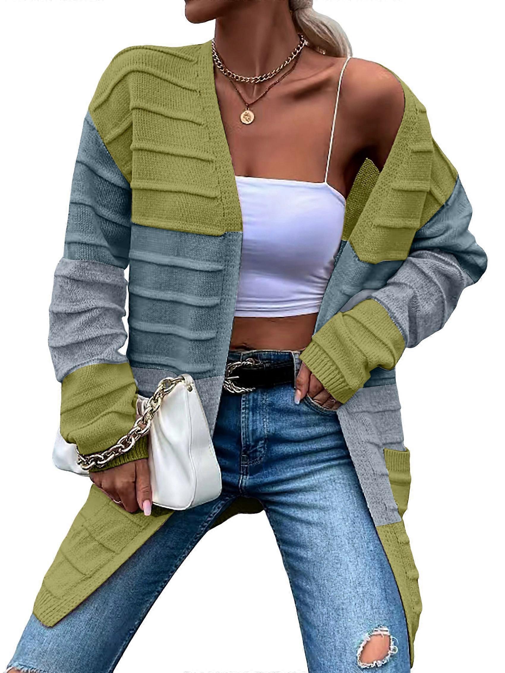 Women'S Color Block Cardigan Long Sleeve Open Front Knit Sweaters Loose Shrugs Knitwear with Pockets Grass Green S