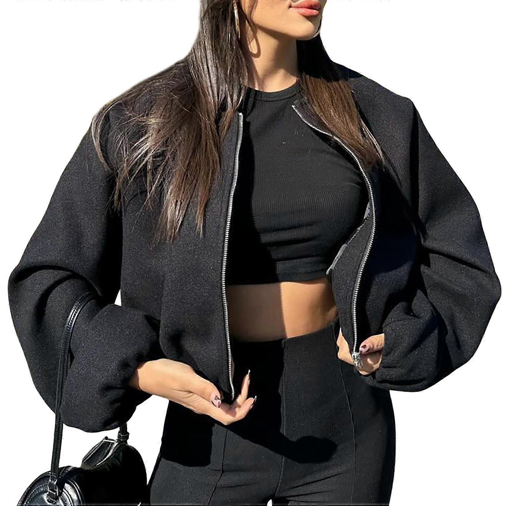 Women Cropped Jacket Casual Zip Up Varsity Jackets Trendy Outwear Coats with Welt Pockets Black M