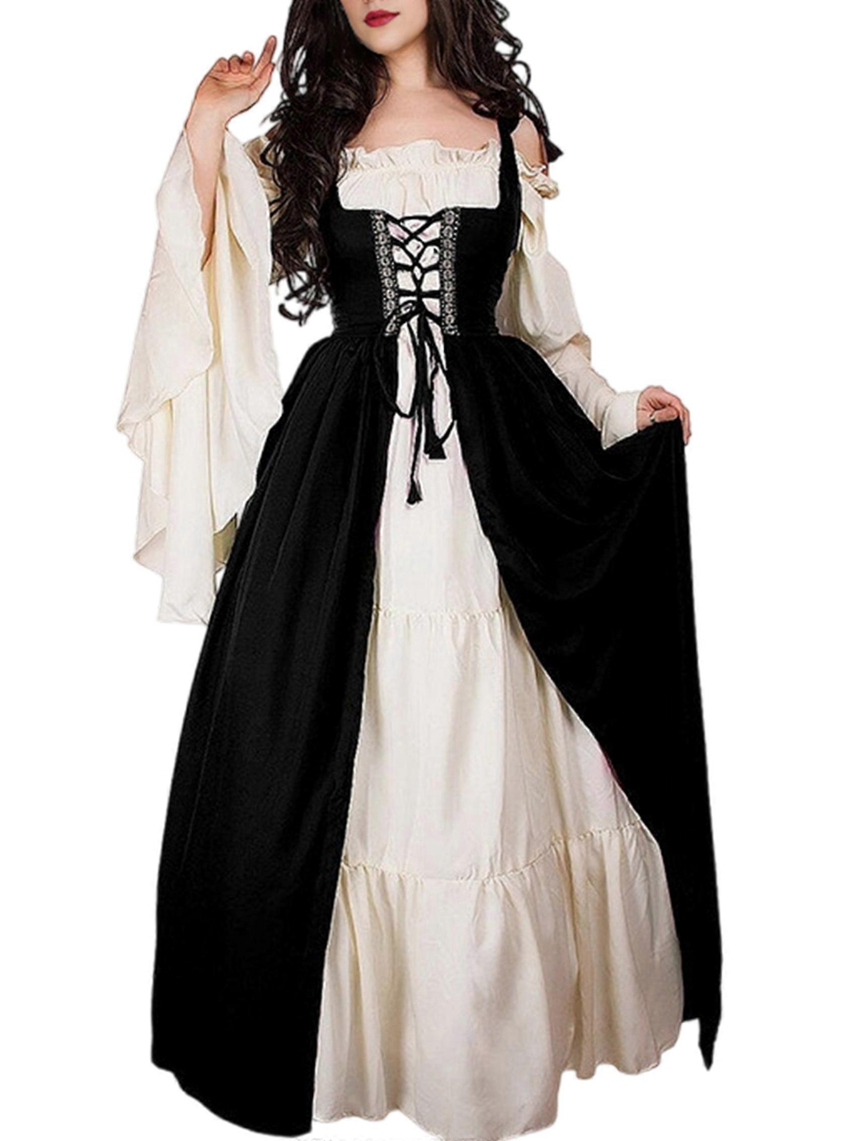 Fabric: 100% polyester Style: Long Flare Sleeve, Floor Length, Off Shoulder, Elastic Waist, Comfortable, Medieval Long Dress for Women, Vintage Masquerade Party Dress Feature: With 2 wide ruffles, elasticized neckline and sorceress sleeves. Front lace-up, shoulder ties and back laces. Irish over costumes dress with lovely trim. Occasion: Great for Medieval Weddings, Cosplay,renaissance,Theatrical Show, Theme Party, etc Refer to size chart in listing. If in between, purchase larger size to cinch down Size: XXXL=US14=EU46=UK18(cm / inch) Bust: 92.0 / 36.22, Waist: 70.0 / 27.56, Length: 146.0 / 57.48 Colour: Black Material: 100% Polyester Package Contents: 1*Women's cosplay costumes Only the above package content, other products are not included. Note: Light reflection and different displays may cause the color of the item in the picture a little different from the real thing. The measurement allowed error is +/- 1-3cm.