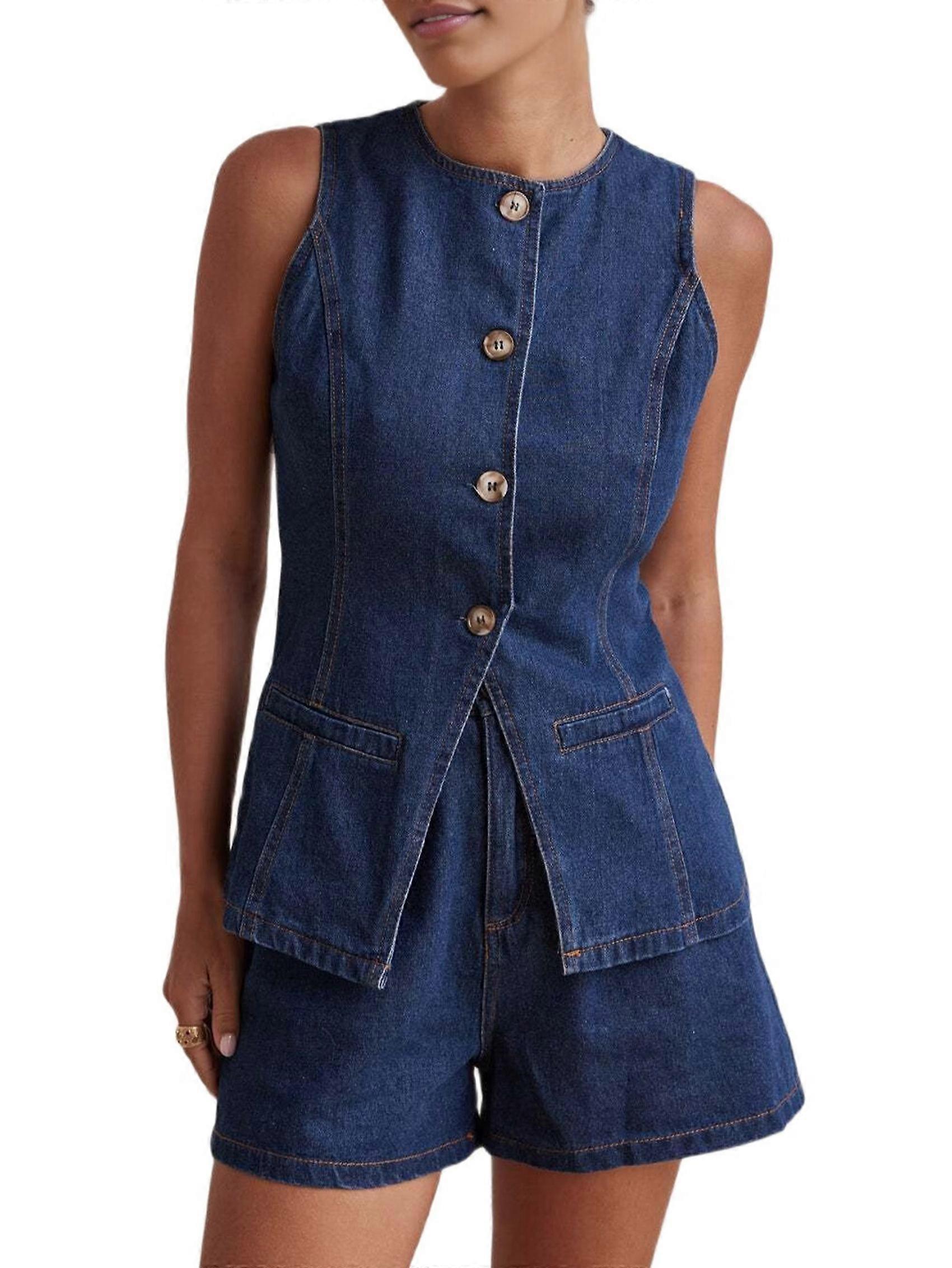 Female Denim 2 Piece Set Casual Business Sleeveless Jean Blazer Vest Tops and Shorts Outfit Tracksuits Dark Blue XXL