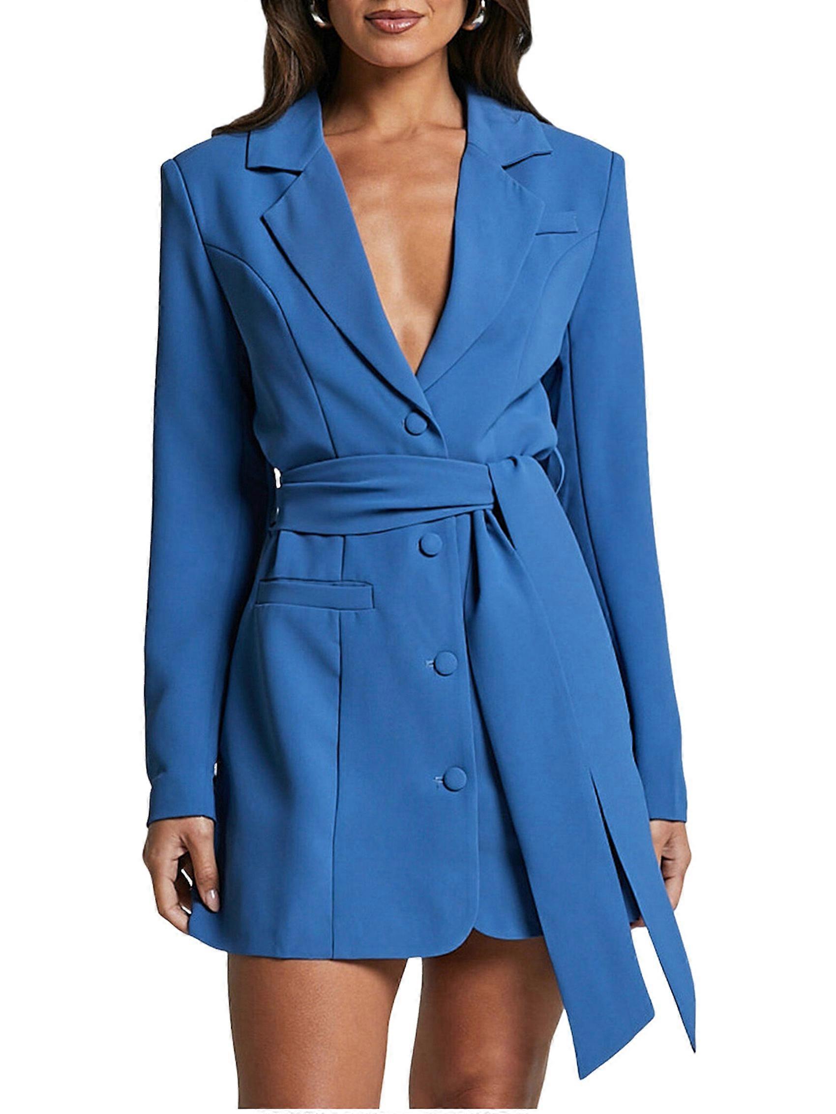 Women Belted Blazer Set Formal Work Trench Coat Long Sleeve Double Breasted Blazer Dress with Belt Royal Blue XL