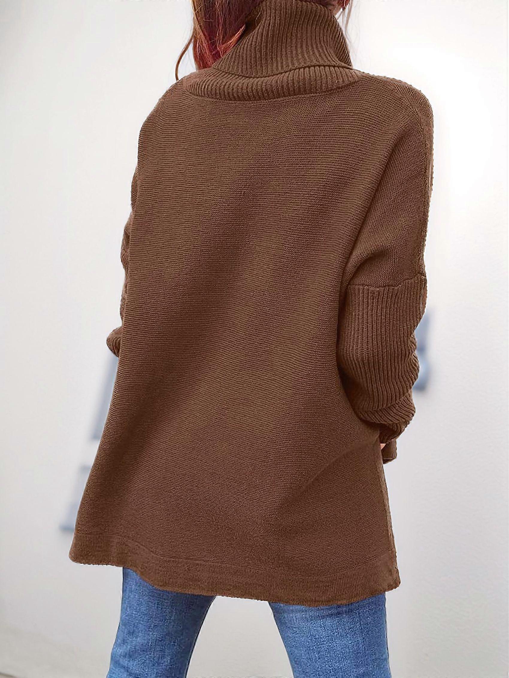Women'S Turtle-Neck Oversized Sweaters Long Batwing Sleeve Spilt Hem Tunic Pullover Knit Tops Brown S