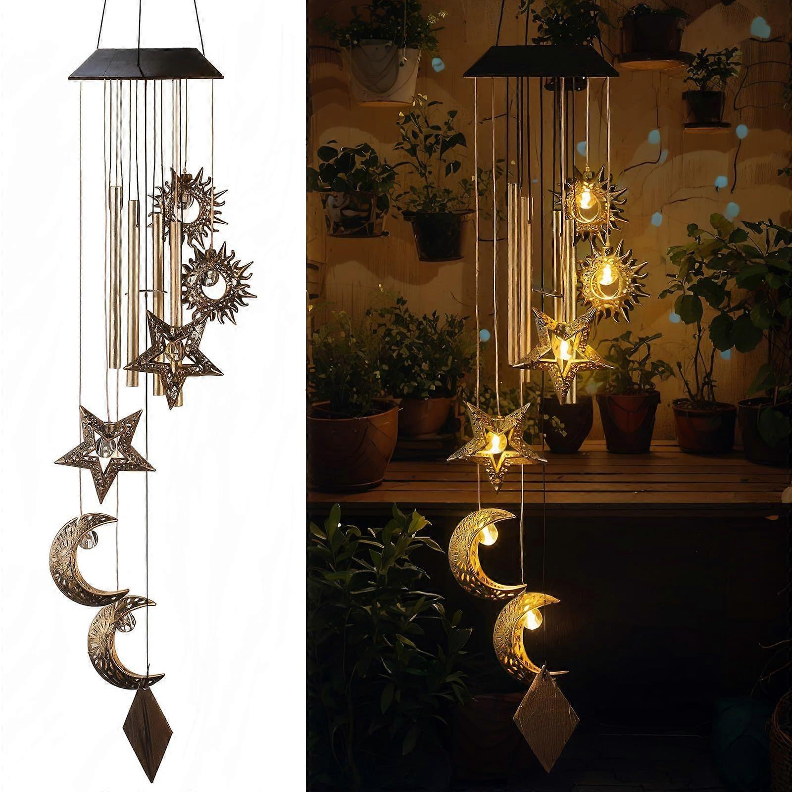 Solar Wind Chimes for Outside: Add a touch of elegance to your outdoor space with these sun, moon, and star wind chimes. Their hollow patterns create a mesmerizing visual effect, especially at night when the warm glow lights up your garden. Ideal Gift for Any Occasion: Perfect for Mother's Day, birthdays, or any special occasion. These wind chimes are a thoughtful gift for mom, grandma, wife, or neighbors, adding a romantlc touch to any garden or yard. Solar Powered & Long-Lasting: Simply place the wind chimes in sunlight for 6 hours, and the light-sensing system will automatically turn on at night, lasting up to 10 hours. Easy to maintain and eco-friendly. Waterproof & Durable: Designed for outdoor use, these wind chimes are waterproof and can withstand rain, snow, and high temperatures. Suitable for decorating gardens, trees, and patios. Easy to Install: Comes with a durable hook for hassle-free hanging. No wires needed—hang them anywhere you like, from balconies to porches, and enjoy the beautiful ambiance.