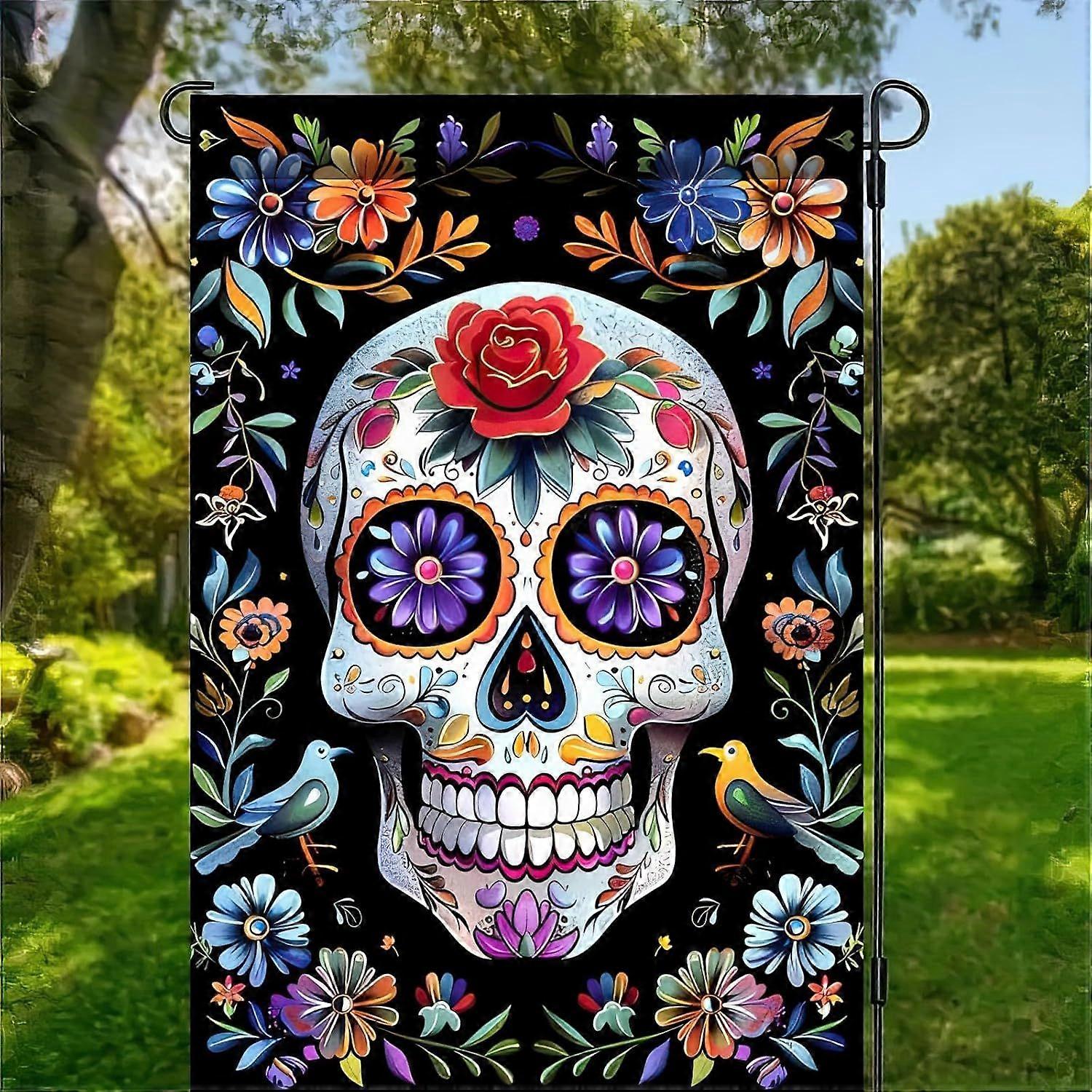 Day of the Dead Garden Flag, Double Sided Floral Skull Decor for Outdoor Yard, Porch and Fiesta Displays