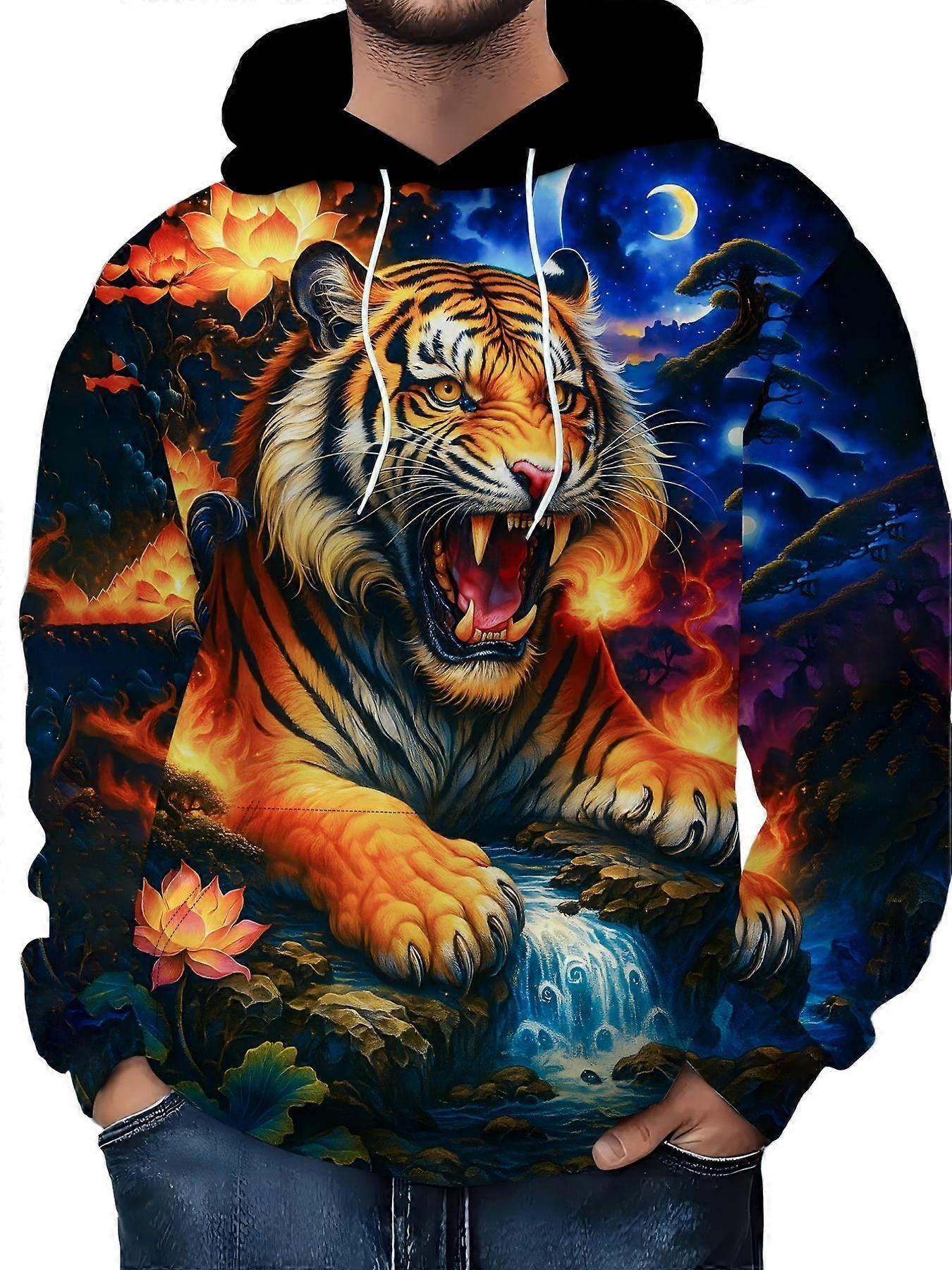 Men’s Bold Graphic Hoodie Fiery Tiger Moon Scene Print Casual Streetwear Pullover
