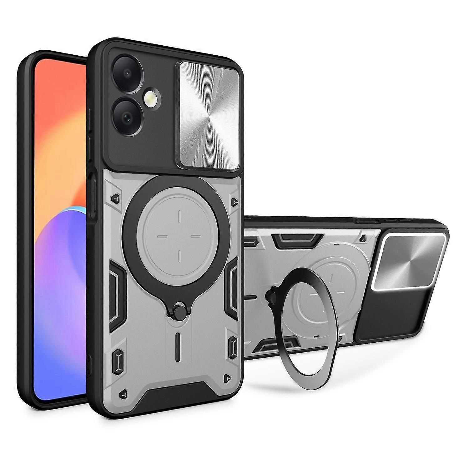 •【Support Magnetic Car Mount】 Built-in iron sheet ensures stable attachment to magnetic car mounts, providing secure holding even on bumpy roads. •【360 Degree Rotating Kickstand Design】 Adjustable rotating ring supports multiple viewing angles, allowing hands-free use for navigation, video watching, or video calls anytime, anywhere. •【Full-Frame Anti-Drop Protection】 Reinforced TPU + PC structure with shock-absorbing corners delivers instant rebound and impact resistance to reduce damage from accidental drops. •【Sliding Lens Cover Protection】 Integrated sliding camera cover fully protects the lenses from scratches, dust, and impacts, while also enhancing privacy when not in use. •【Rugged Mechanical Style】 Industrial-inspired design with metal-texture accents adds a tough, modern look while improving grip and everyday durability. Compatible with: •Galaxy A06 4G Package included: •1 x Phone Case •Other items not included