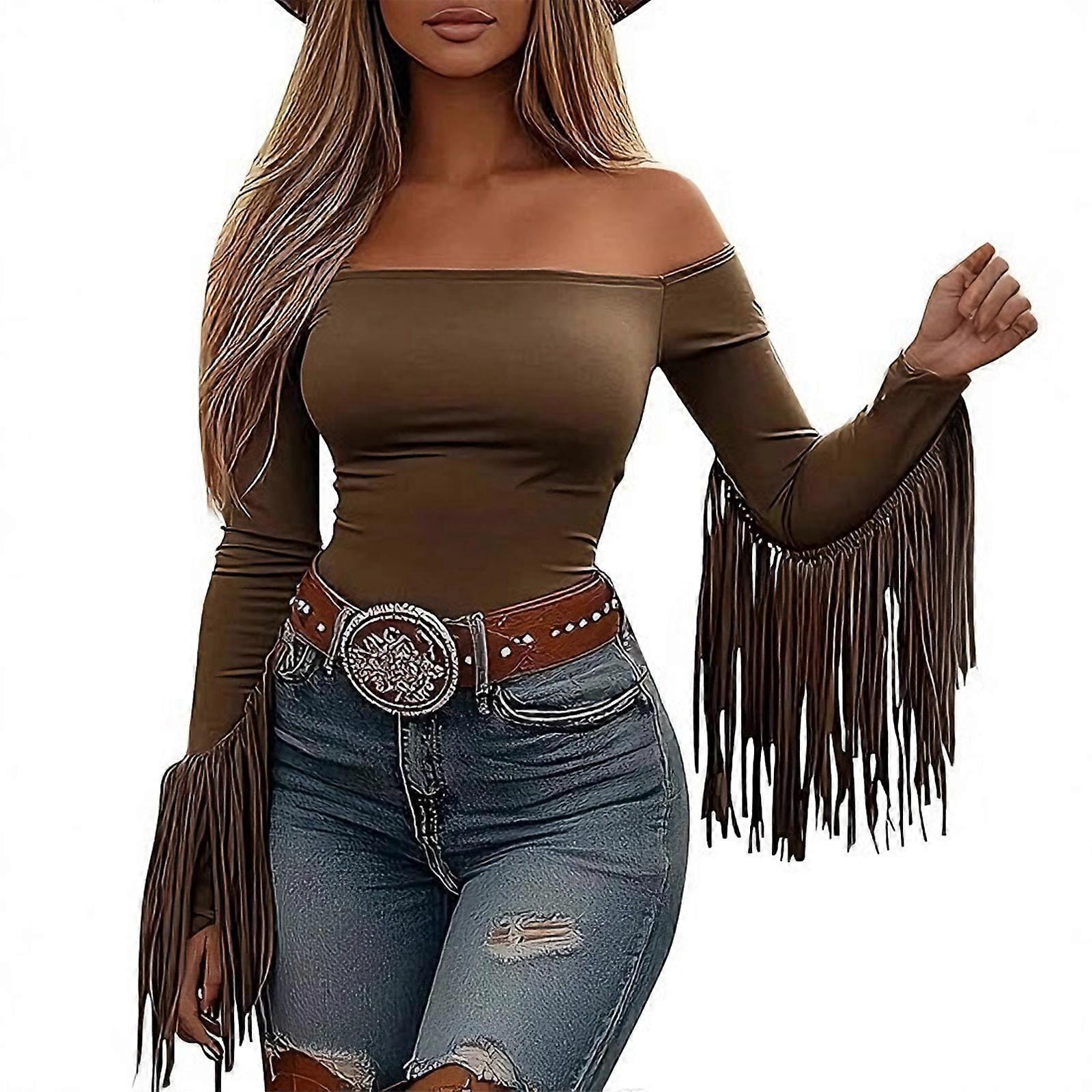 Long Sleeve Fringed Tassels Short Crop Top Western Cowgirl Off Shoulder T-Shirt Slim Fit Stretchy Blouse For Women XL light brown