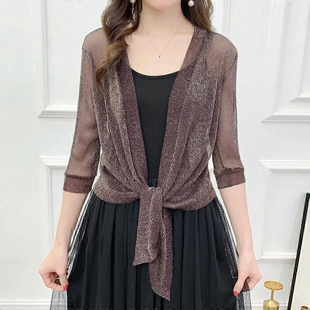 Glitter Tie Up Open Front Shrug Ladies Shawl Cropped Beach Summer Sun Protection Clothing Air-Conditioning Shirt
