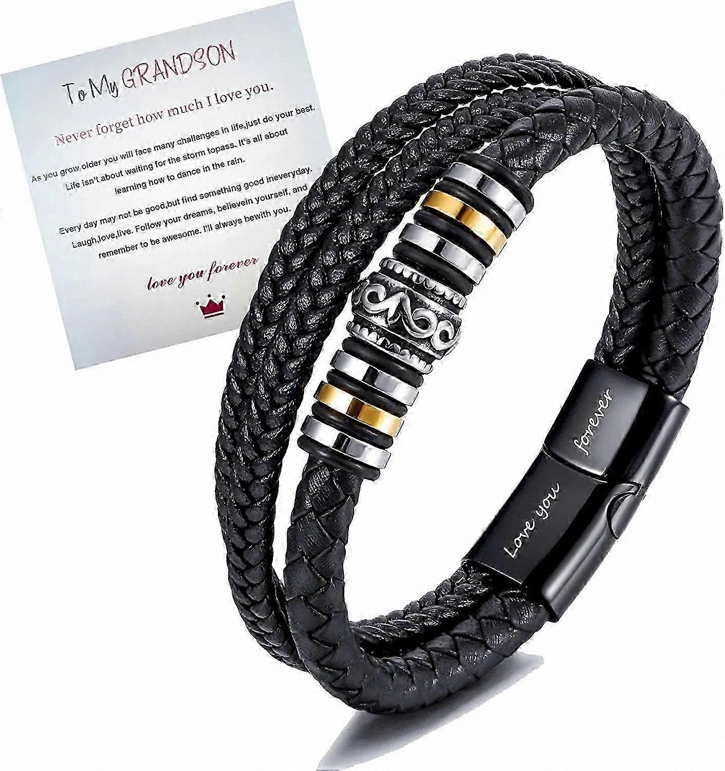 To My Grandson Bracelet – Engraved with “Love You Forever,” a meaningful leather bracelet from grandma or grandpa. To My Son Bracelet – Engraved with “I Will Always Be With You,” a heartfelt gift from mom and dad. Express Love Forever Bracelet – A braided leather wristband with an engraved message, symbolizing enduring love. Inspirational bracelet designed to encourage confidence and self-belief. Men’s Braided Leather Bracelet – Made from high-quality PU leather and stainless steel, featuring a magnetic clasp. Handwoven for comfort and style. Adjustable wristband with a vintage, classic design—ideal for men. Perfect for everyday wear or as a thoughtful gift for husband, boyfriend, father, or friends on Valentine’s Day, Christmas, birthdays, Thanksgiving, or other special occasions.