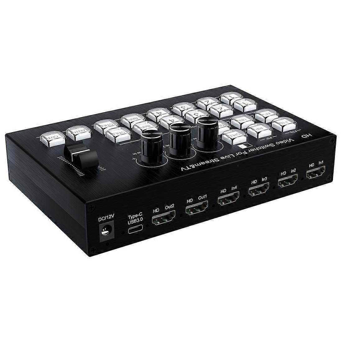 Main Function - 4-Channel Live Switching]This live streaming video mixer supports 4 HDMI inputs, allowing you to connect cameras, computers, and media players at the same time. It enables fast, stable switching between multiple signal sources, ensuring smooth, professional transitions for live broadcasts, webinars, church services, gaming Equipped with 4 HDMI input ports and 2 HDMI output ports, this HDMI video switcher lets directors monitor each source in real time while previewing the next scene to be pushed live. This multi-view workflow helps you accurately time transitions, improve broadcast reliability, and maintain precise control over your live production. The live streaming video switcher supports stable HDMI input up to 4K@30Hz (backward compatible) and outputs crisp 1920x1080@60Hz full HD. This ensures detailed, vivid images and smooth motion, delivering an immersive viewing experience that meets the needs of professional live streaming, content creation, and high-quality recording. Beyond video management, this unit also functions as a digital audio mixer, allowing you to handle multiple audio sources at once. You can mix and balance microphones, line inputs, and device audio, adjust volume and tone, and keep sound in perfect sync with video, providing clear, well‑balanced audio for a more engaging, polished broadcast. The video switcher supports seamless direct cuts and gradual transitions to match different production styles. It also offers Picture-in-Picture (PiP) and dual-screen simultaneous display for richer layouts. Smooth audio switching keeps sound synchronized with every scene, giving you a cohesive Plug Type:EU Plug,it applies to Indonesia, Germany, France, Spain, Italy and so on. Voltage: AC220V Color: Black Material: plastic Specification: EU Plug Package Contents: 1*Live Streaming Video Mixer Only the above package content, other products are not included. Note: Light reflection and different displays may cause the color of the item i