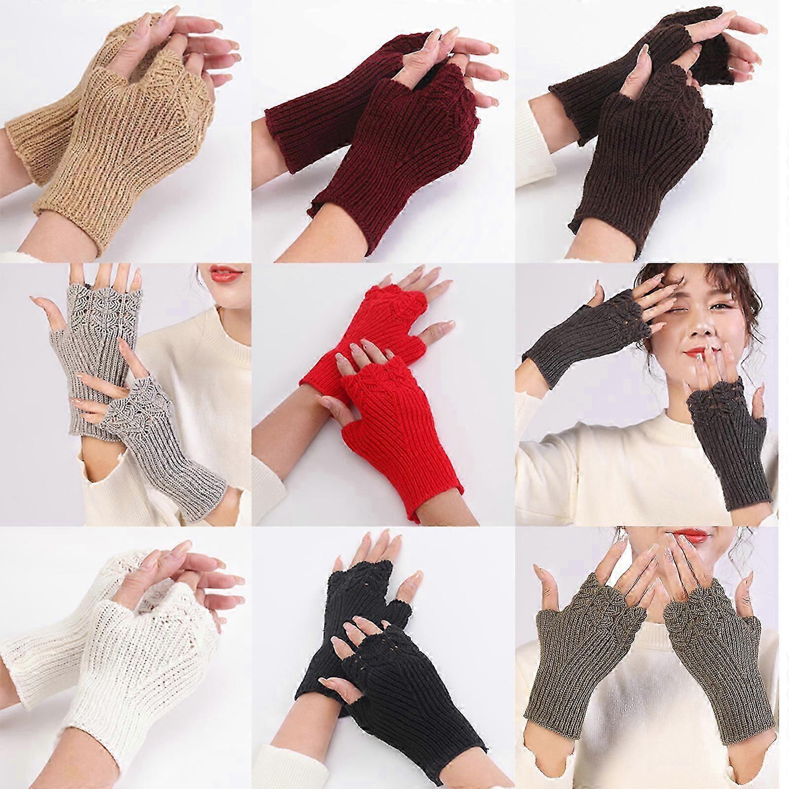 Women Student Autumn Hollow Out Knitted Fingerless Gloves Fish Scale Design Solid Color Half Finger Mittens Thumb Hole Arm Warmers khaki