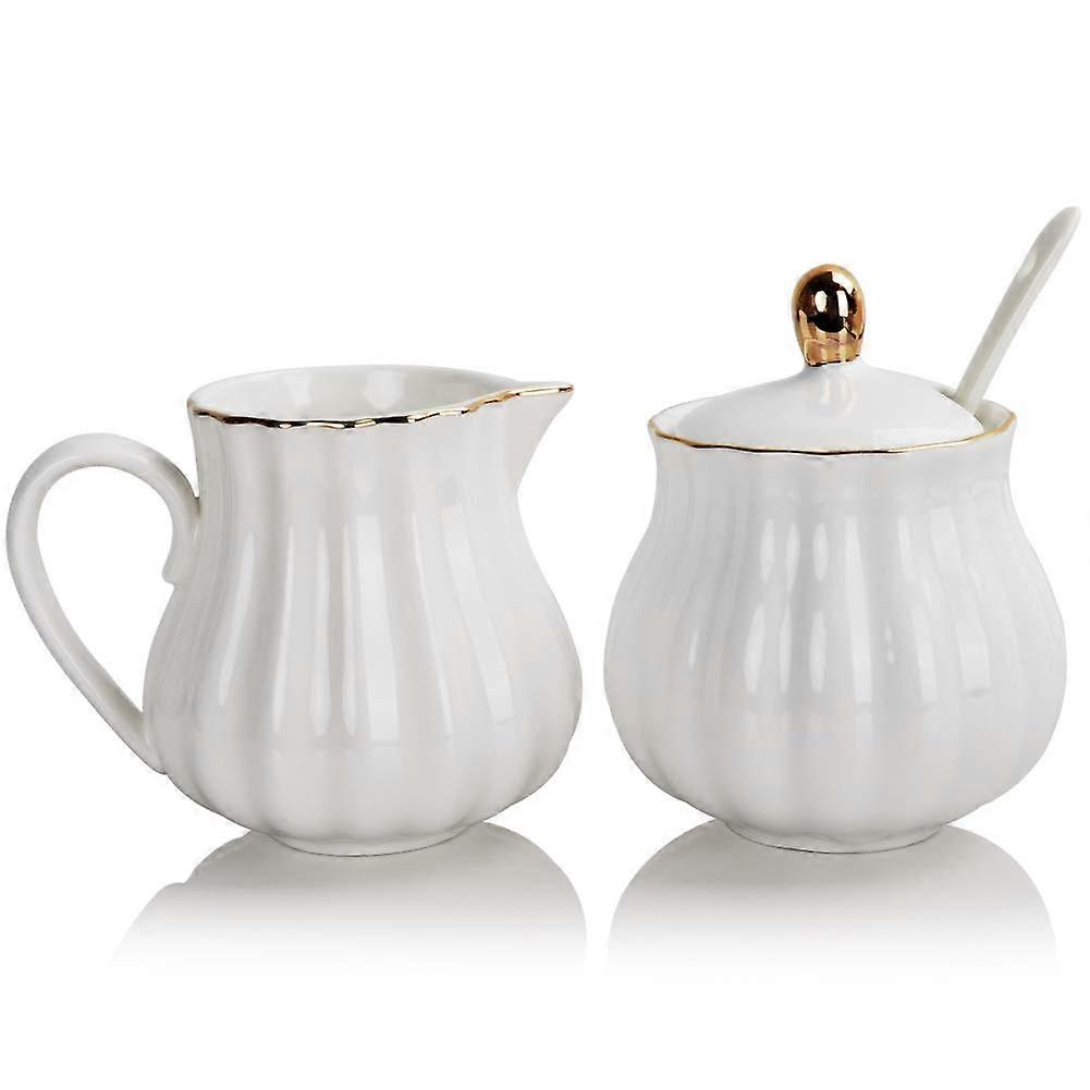 Ceramic Sugar and Creamer Set with Lid and Spoon, Elegant Pumpkin Design, White Porcelain Coffee Serving Set