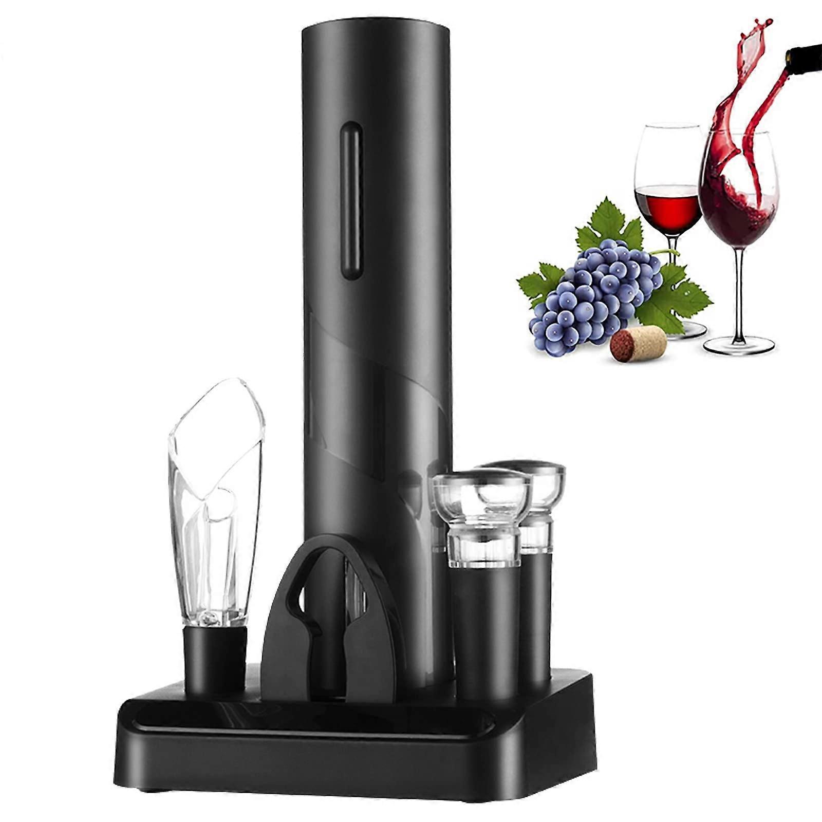 Electric Wine Opener Set with Foil Cutter, Vacuum Stopper and Pourer, Battery Operated, Black