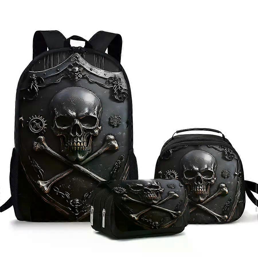 3pcs Set Skull Round 3D Carton Flip Pencil Waterproof Nylon Lined School Backpack for Boys/Girls Best Gifts for Kids
