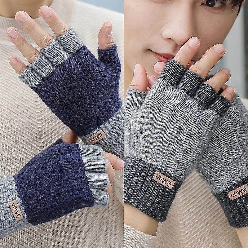 2Pairs Men Winter Fingerless Half Finger Knitted Gloves Office Knitted Warm Exposed Finger Thick Gloves Elastic Driving Gloves