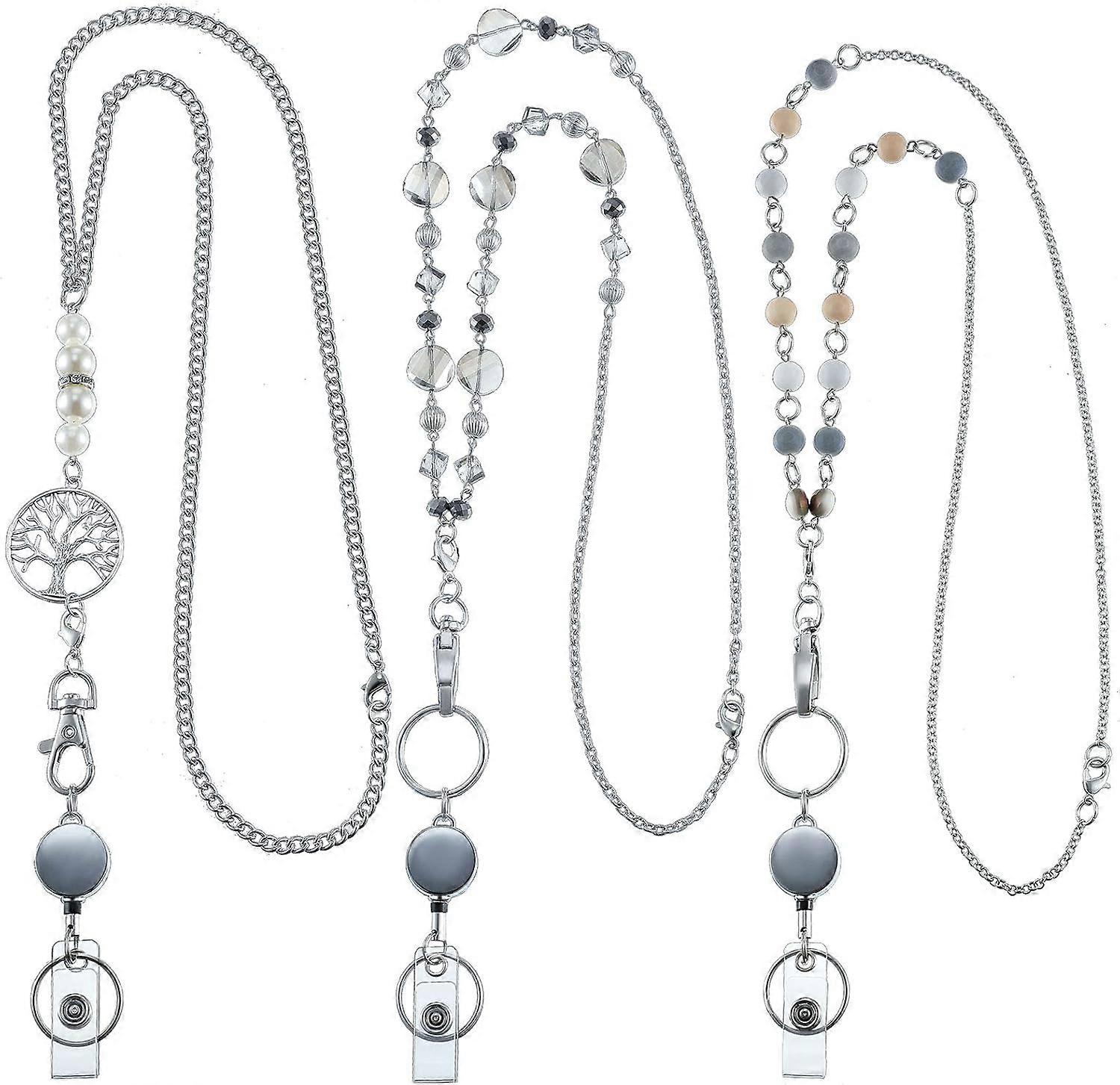3 Pieces ID Badge Beaded Lanyard Necklace with ID Holder Clip Stainless Steel Beaded Chain Lanyard Necklace for Women Retractable Badge Reel Valentin