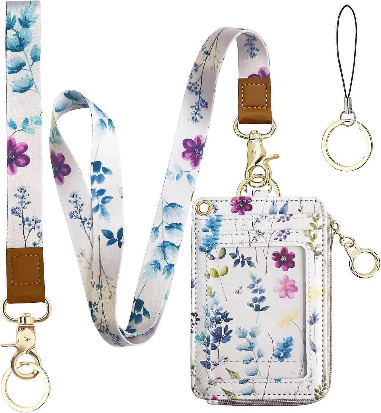 2-in-1 ID Badge Holder & Lanyard Wallet for Womens Cute Floral Zipper Wallet with Removable Wrist & Neck Lanyard, Clear Window, 5 Card Slots, Ring Ke